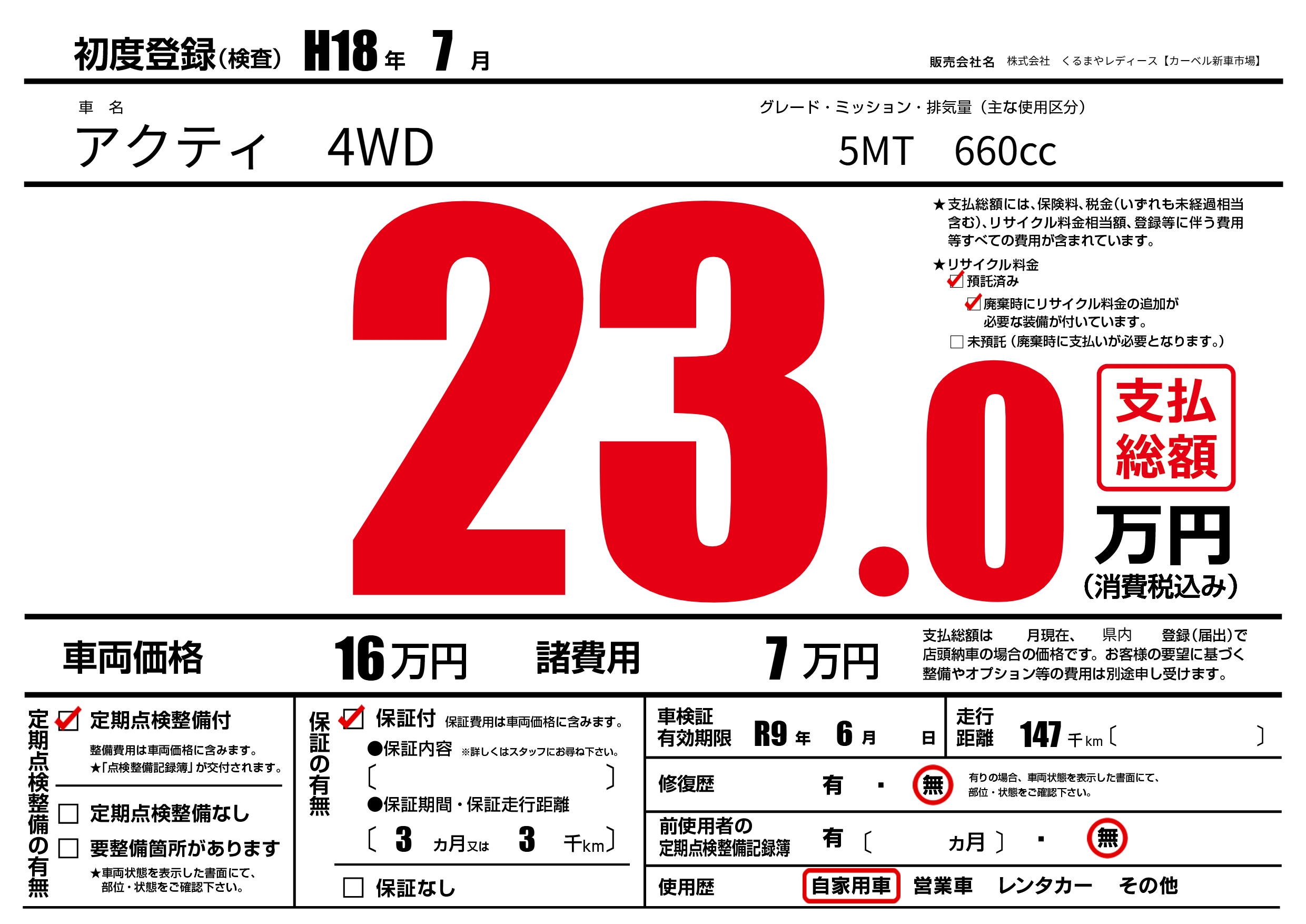 | 走行キロ | 14.7万km | 初年度登録 | H18年7月 |