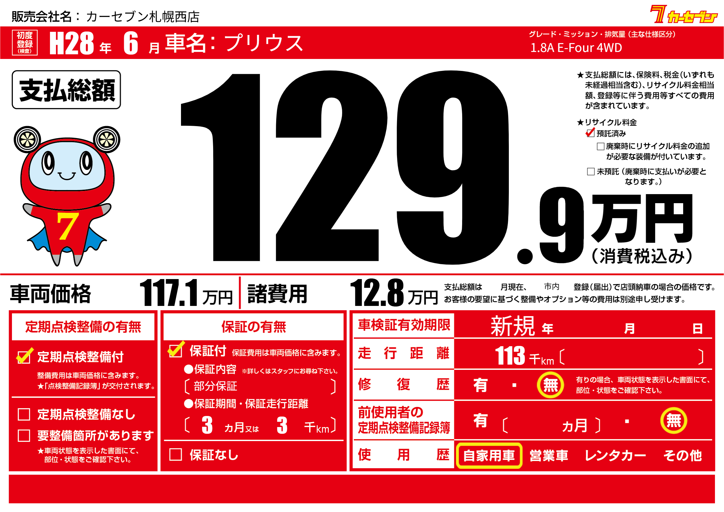 | 車名 | プリウス | グレード ミッション 排気量 |