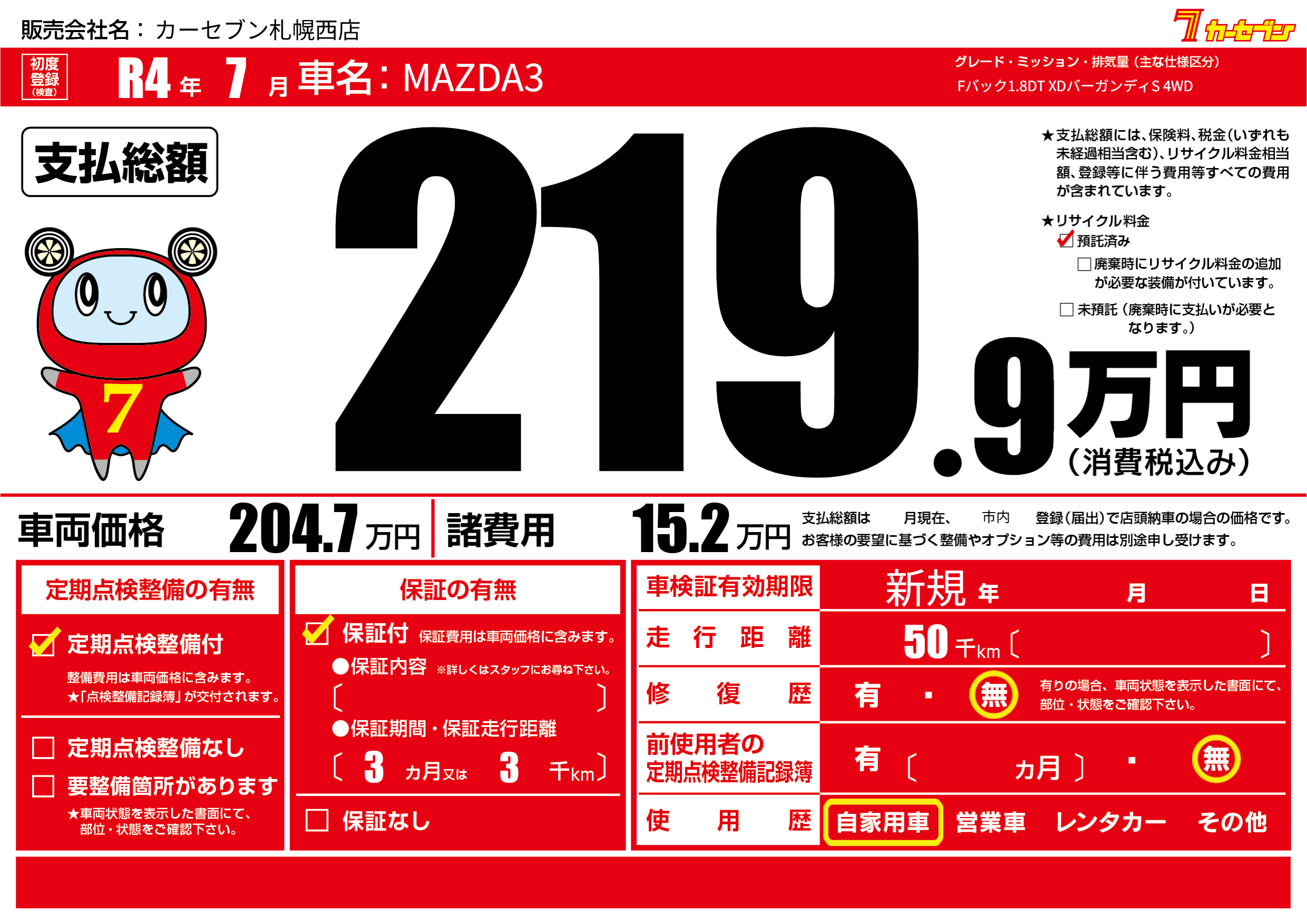 | 車名 | MAZDA3 | グレード ミッション 排気量 |