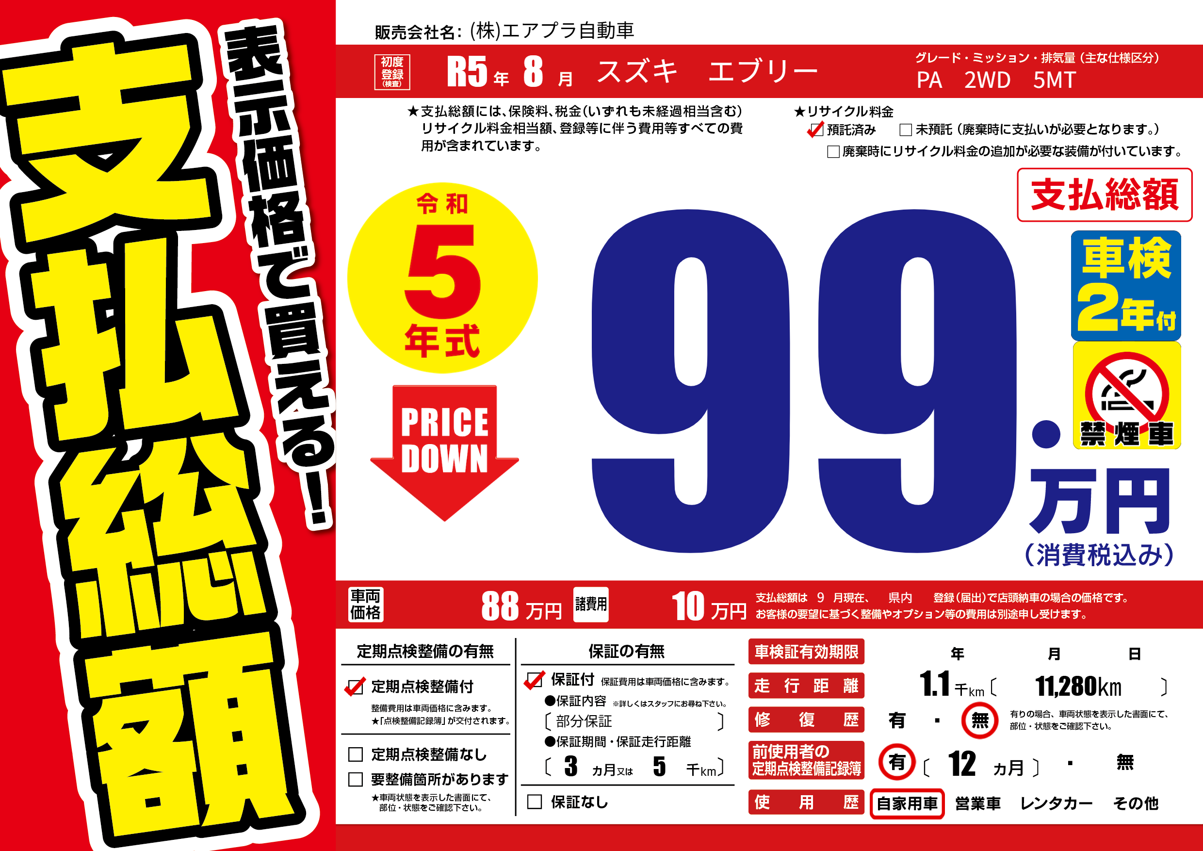 保証付き 保証内容(部分保証) 3ヶ月または(5)千kmまで |