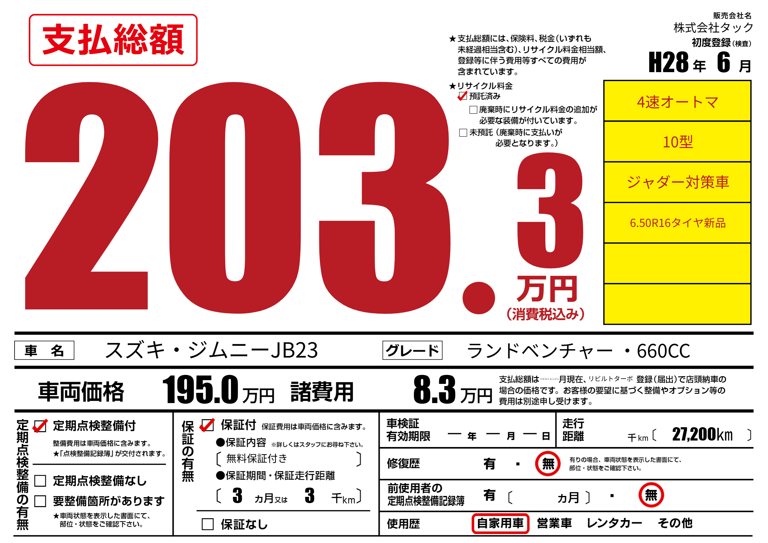| 車名 | スズキ・ジムニーJB23 | グレード ミッション 排気量 |