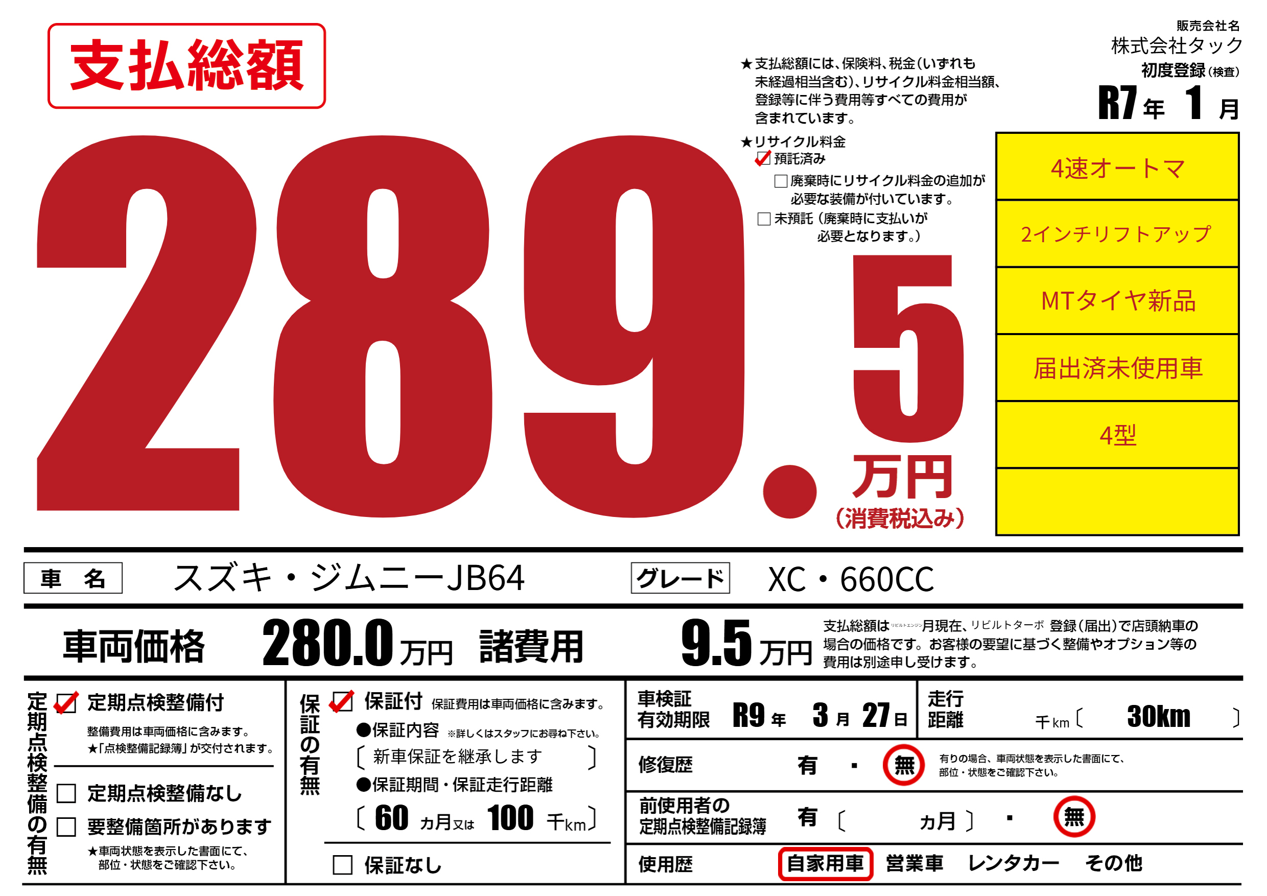 | 車検制限 | R9年 3月 27日 | ||