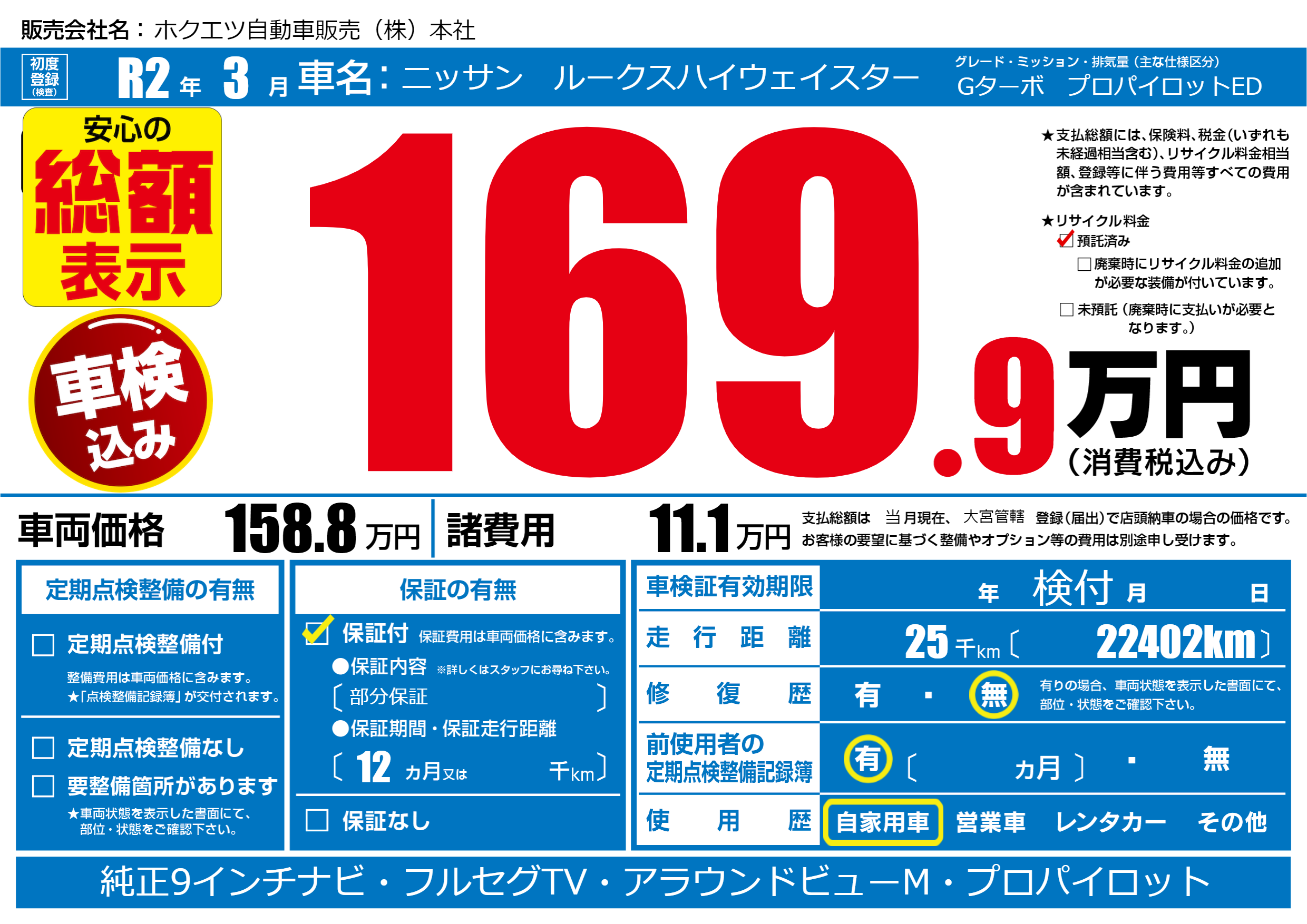 | 車名 | ニッサン ルークスハイウェイスター | グレード ミッション 排気量 |
