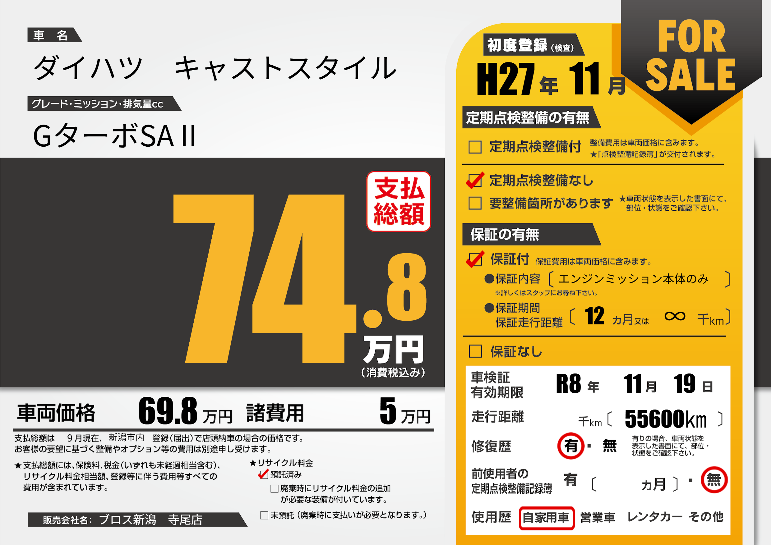 | 車名 | ダイハツ キャストスタイル | グレード ミッション 排気量 |