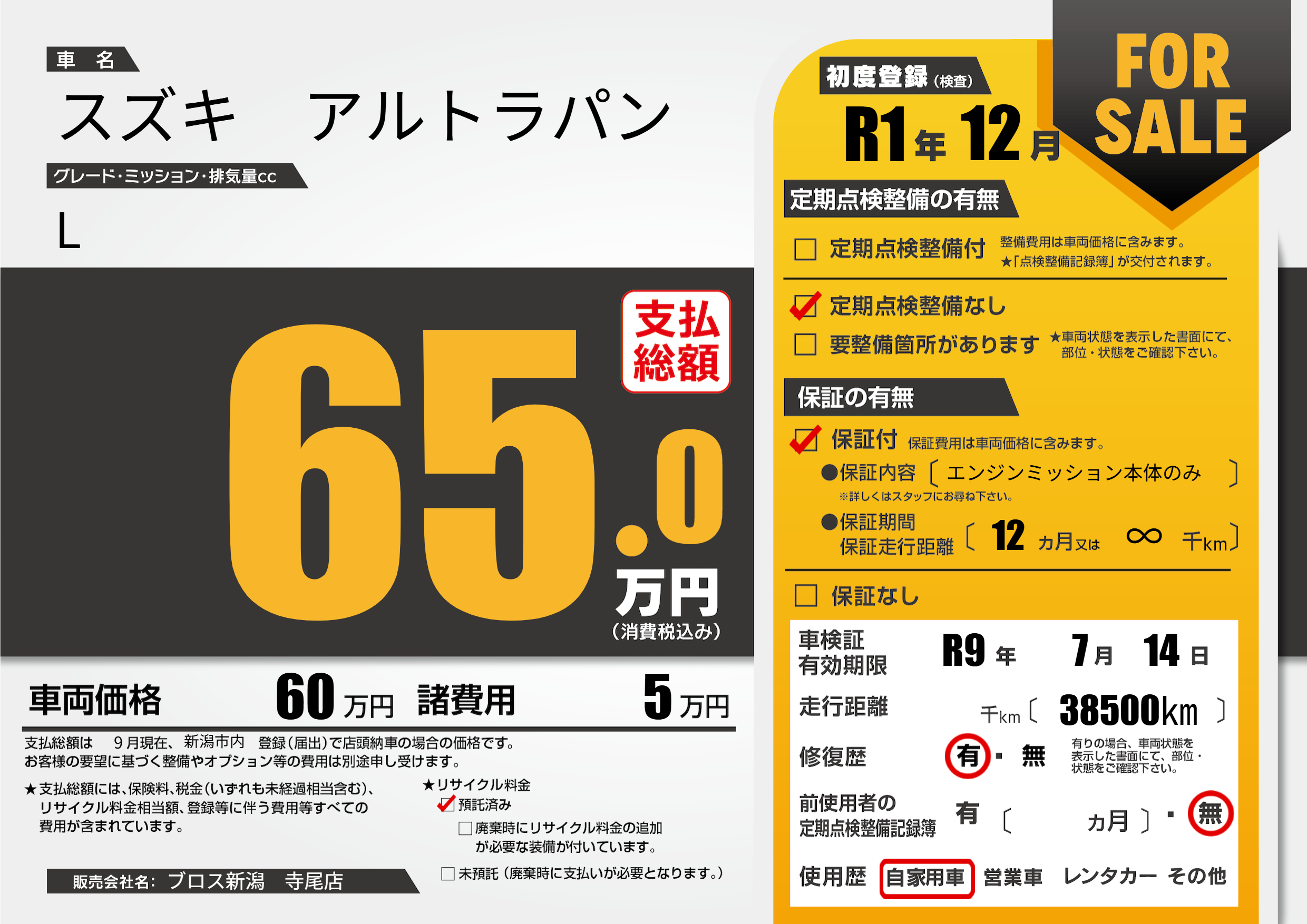 | 走行キロ | - | 初年度登録 | R1年12月 |