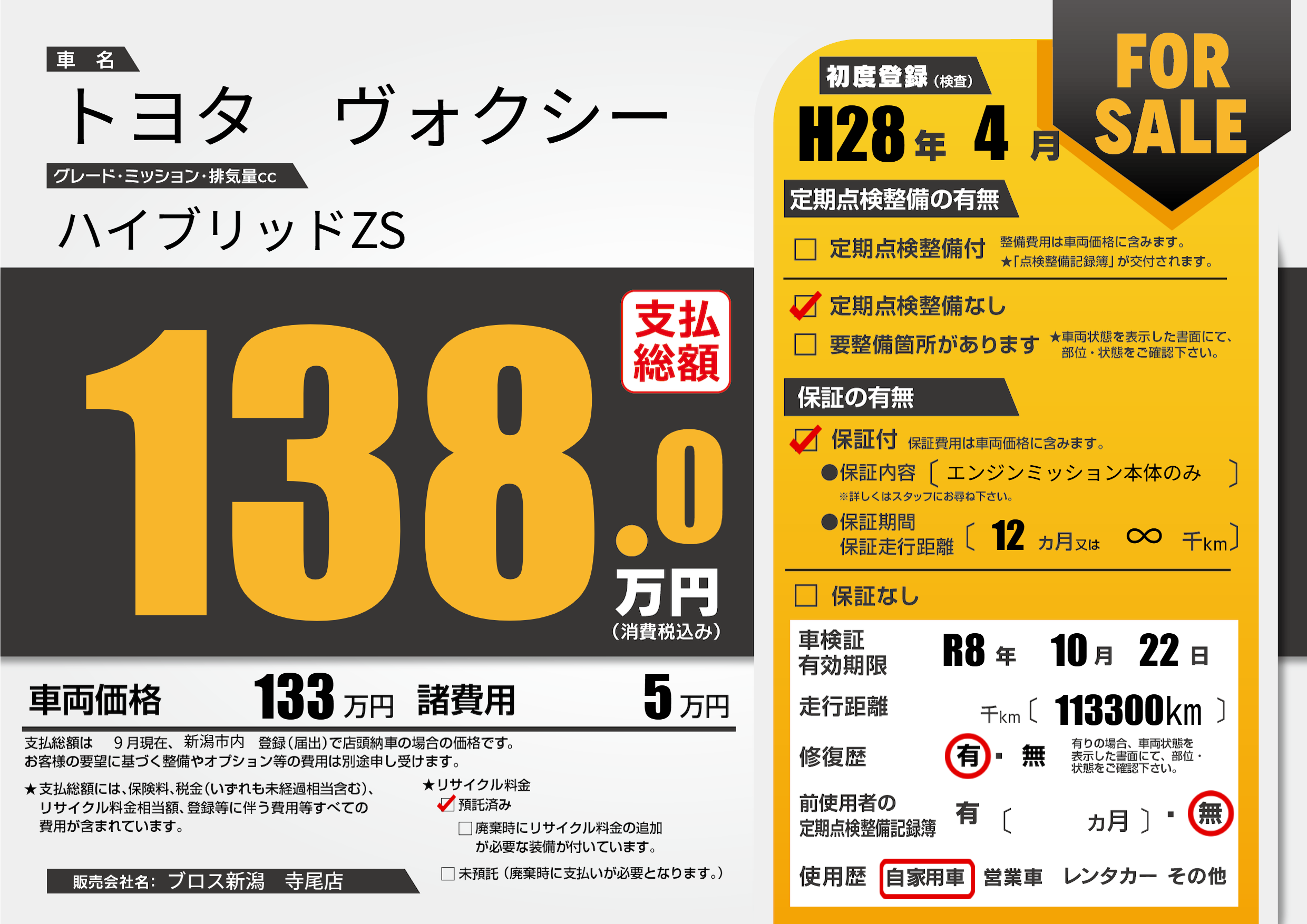 | 走行キロ | - | 初年度登録 | H28年4月 |