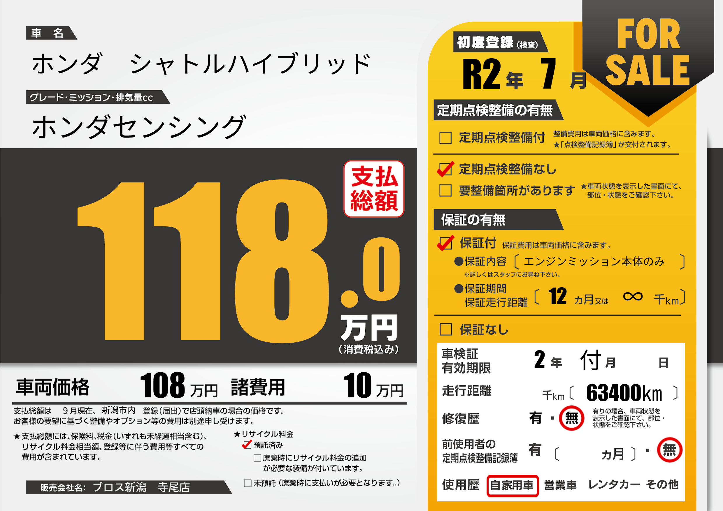 | 車名 | ホンダ シャトルハイブリッド | グレード ミッション 排気量 |