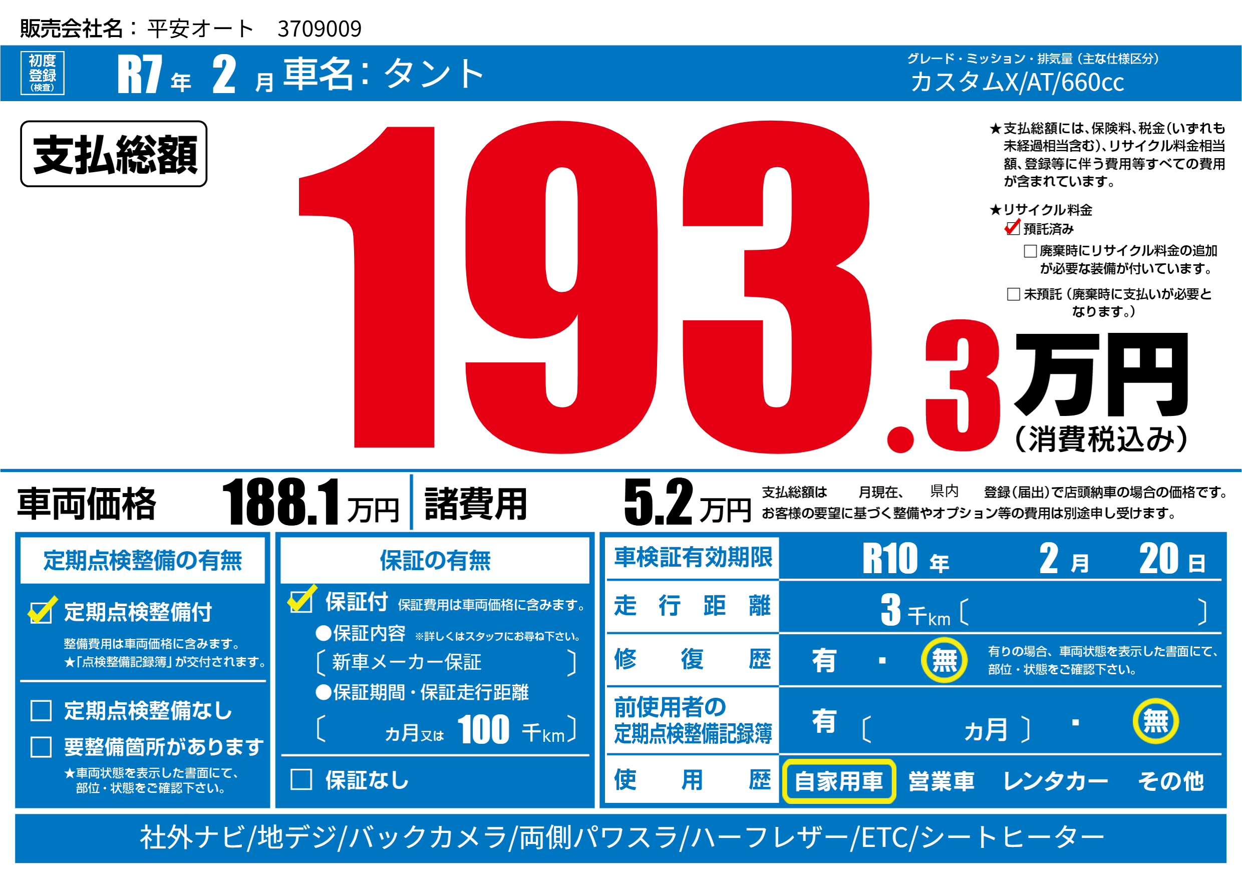| 車検制限 | R10年 2月 20日 | ||