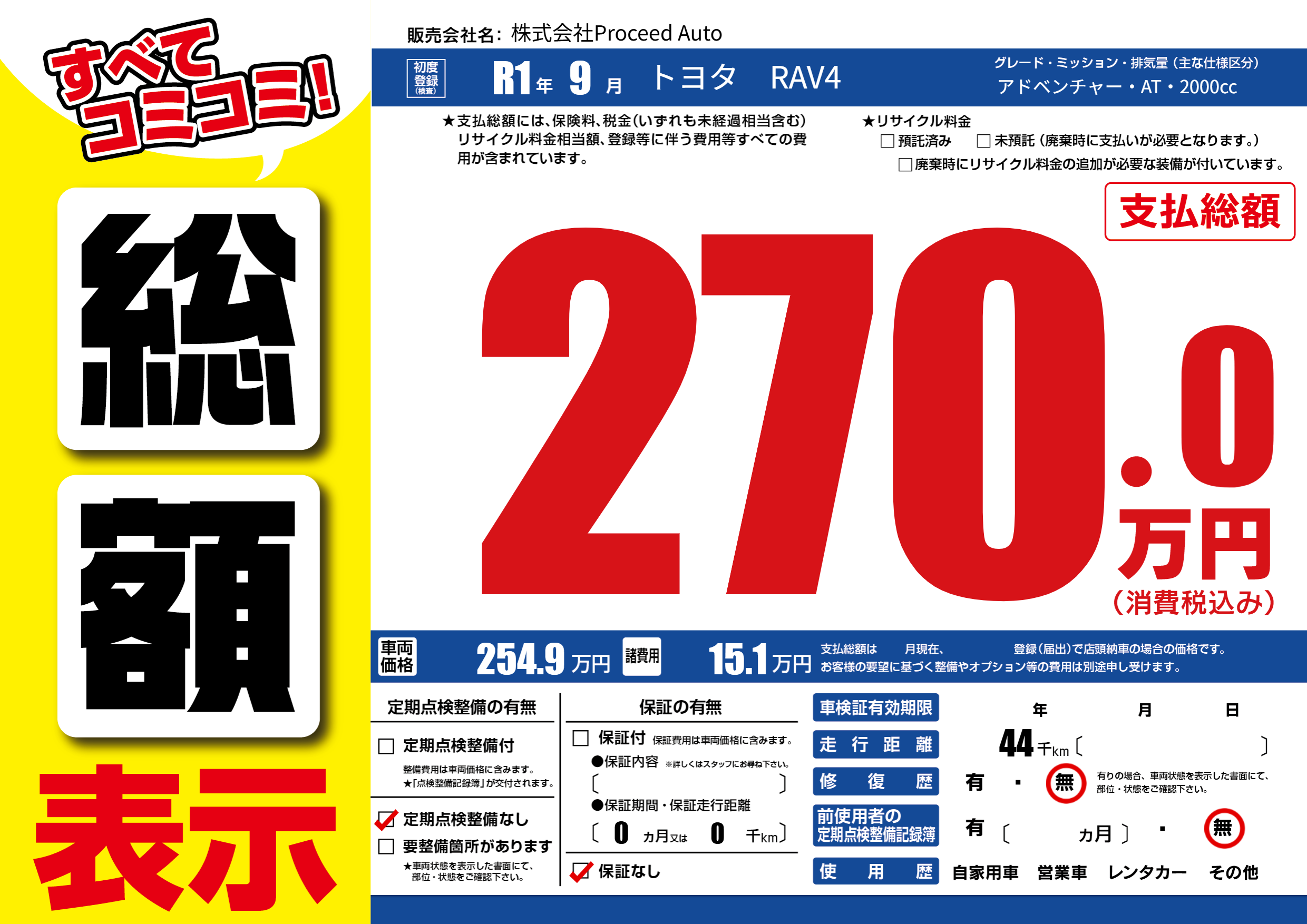 | 車名 | トヨタ RAV4 | グレード ミッション 排気量 |