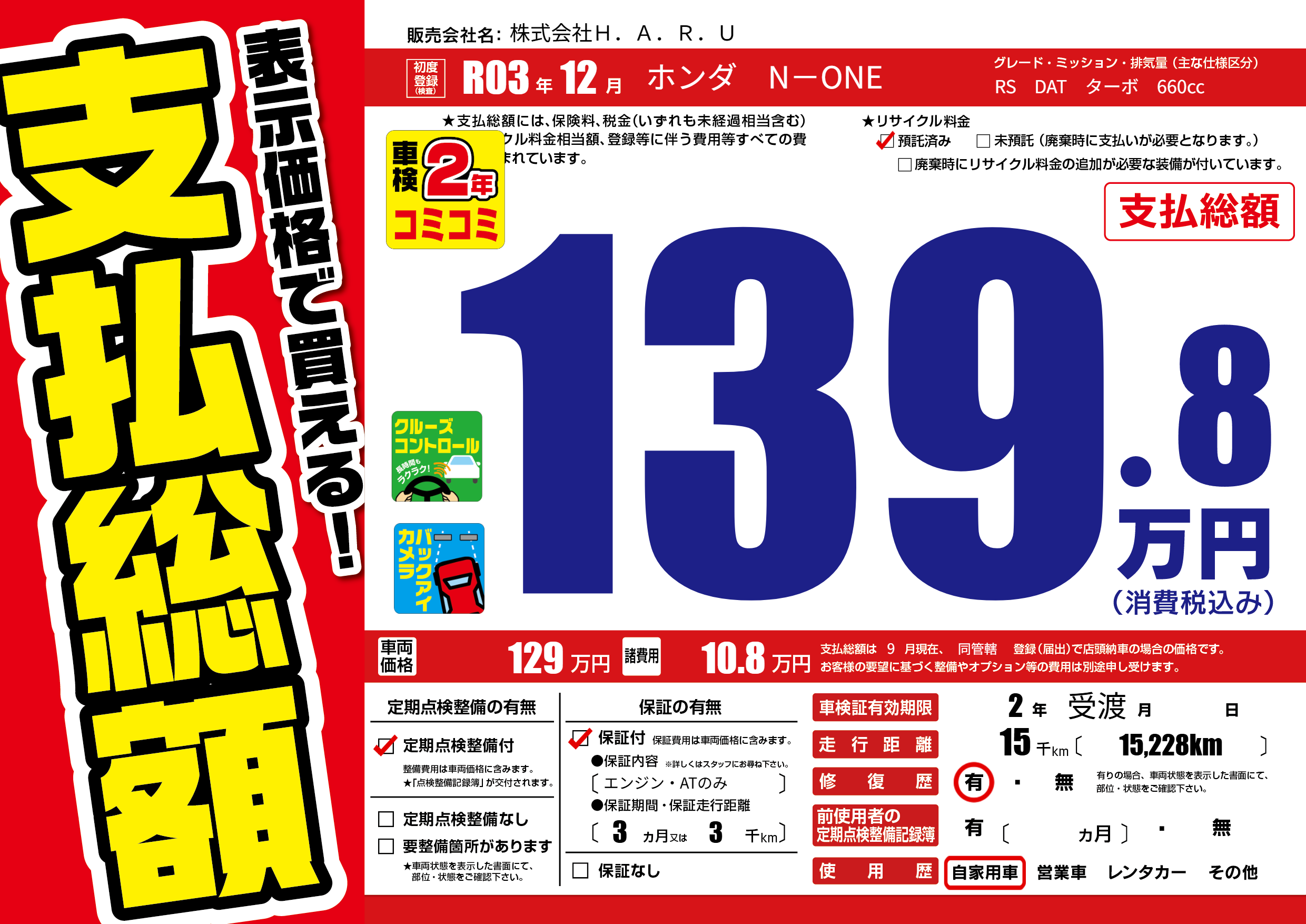 | 走行キロ | 1.5万km | 初年度登録 | R03年12月 |