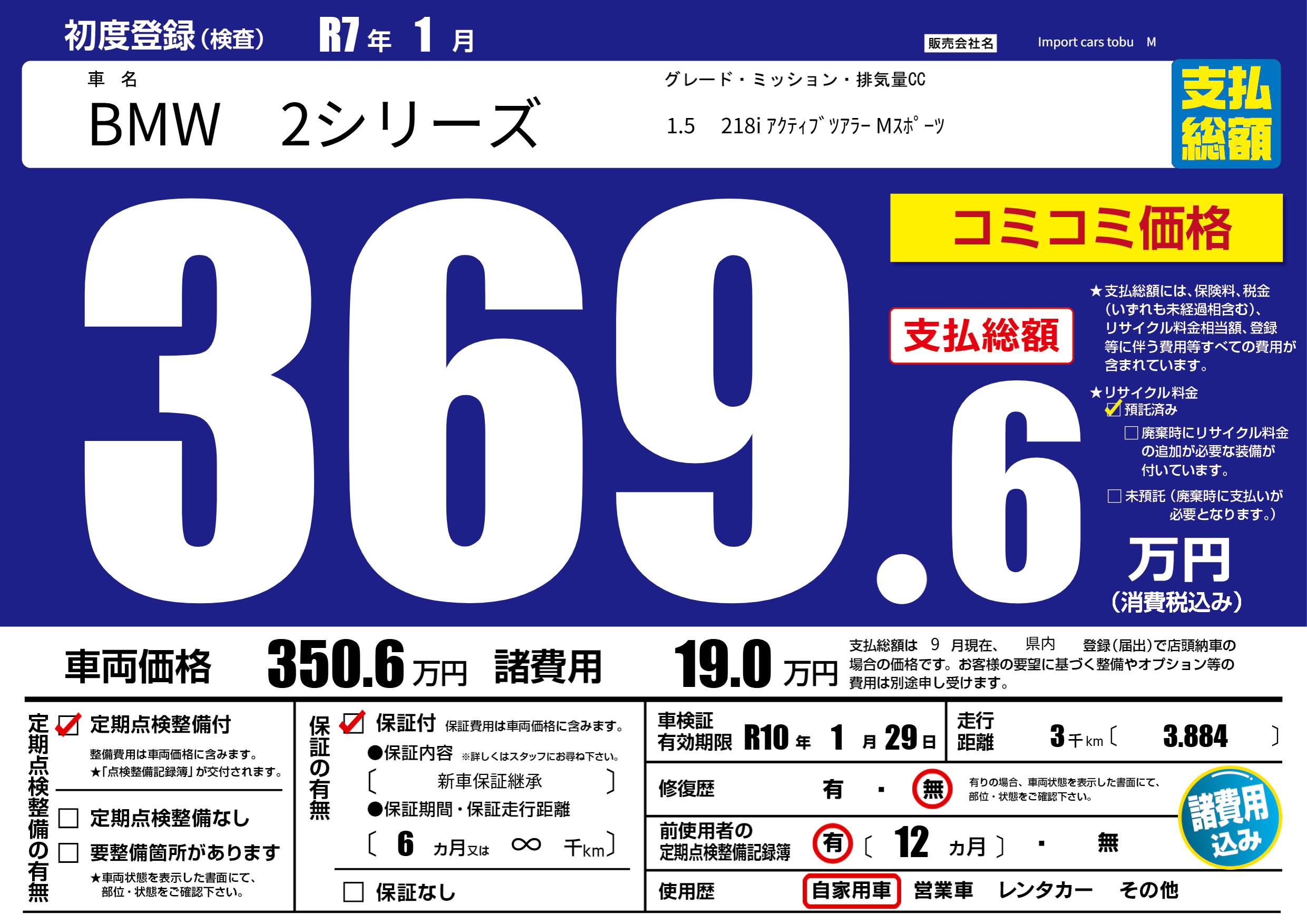 | 車名 | BMW 2シリーズ | グレード ミッション 排気量 |