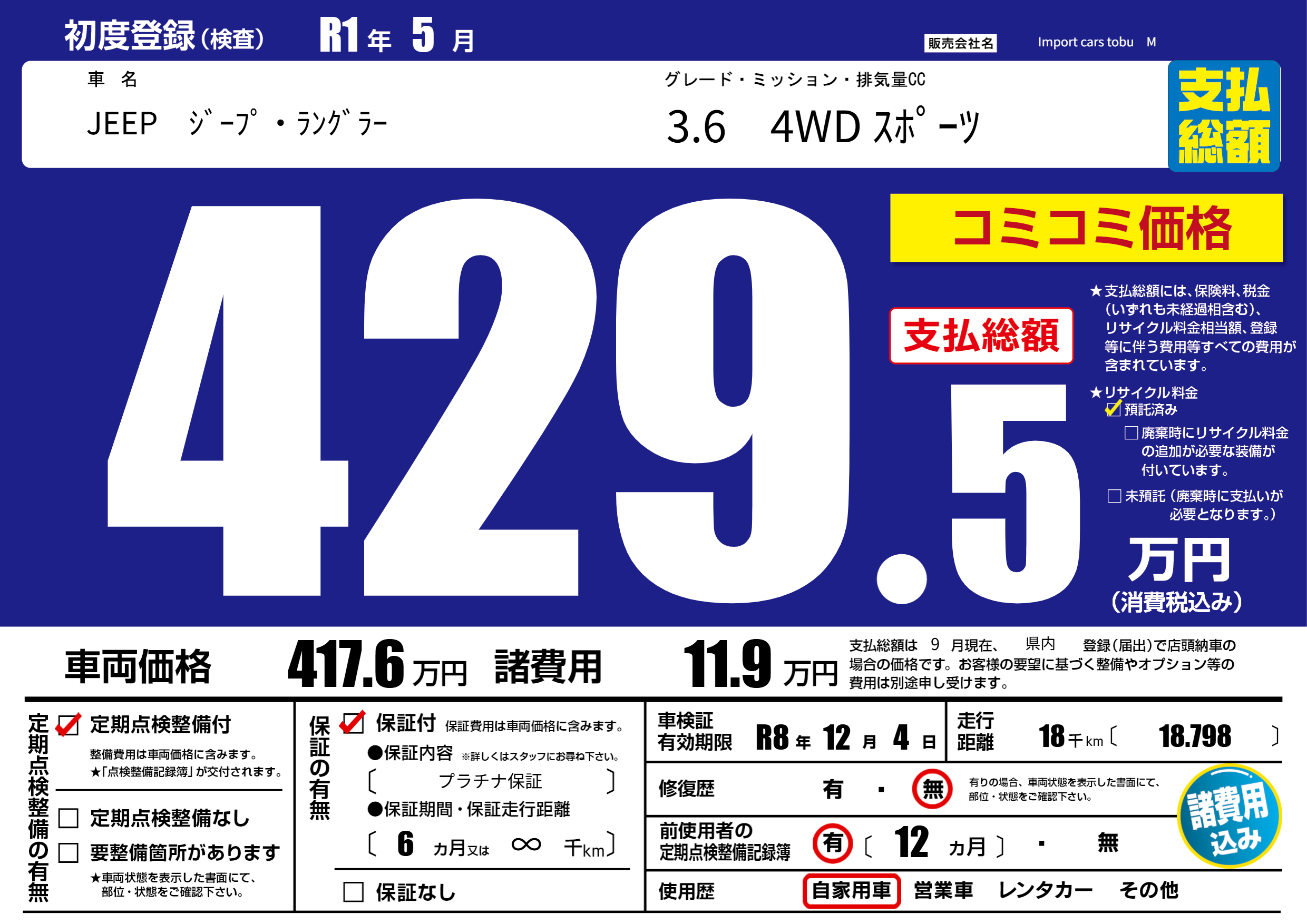 | 車名 | JEEP ジープ・ラングラー | グレード ミッション 排気量 |
