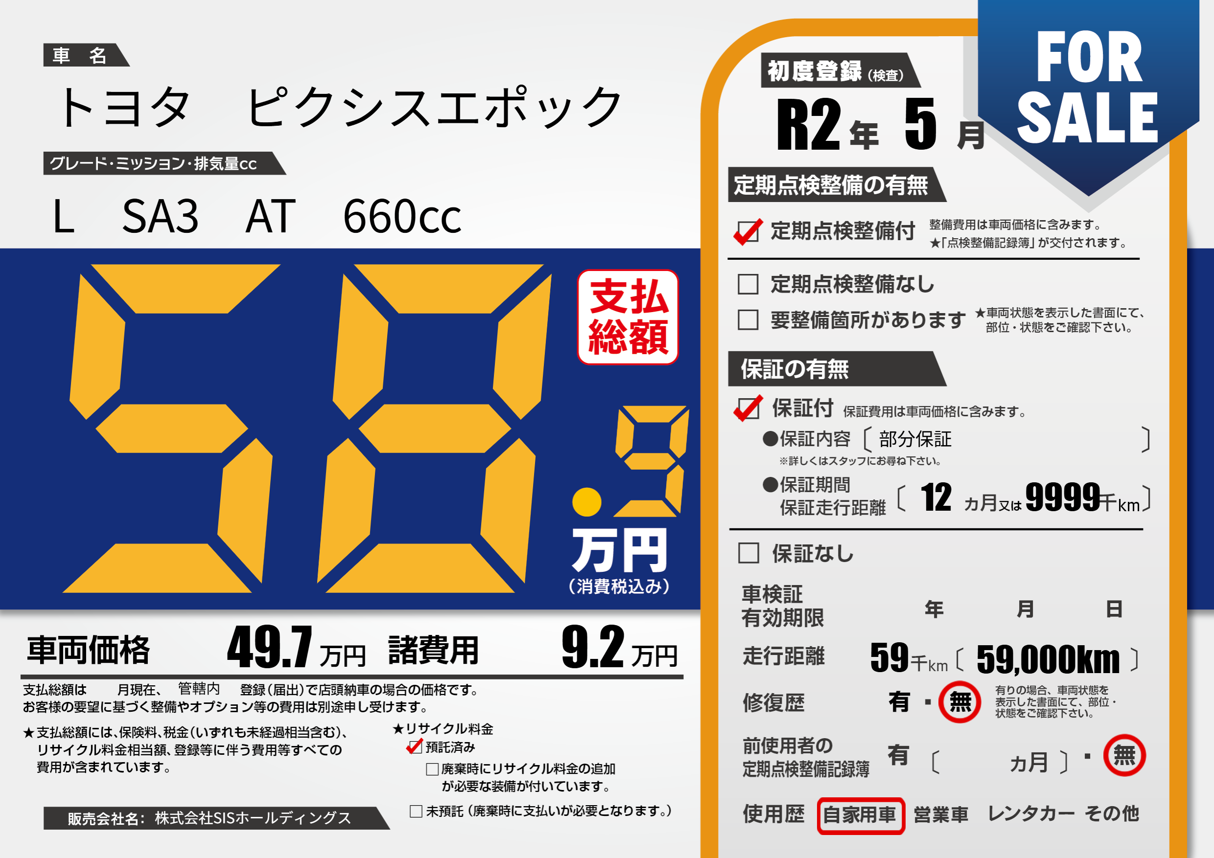 保証付き 保証内容(部分保証) 12ヶ月または(9999)千kmまで |