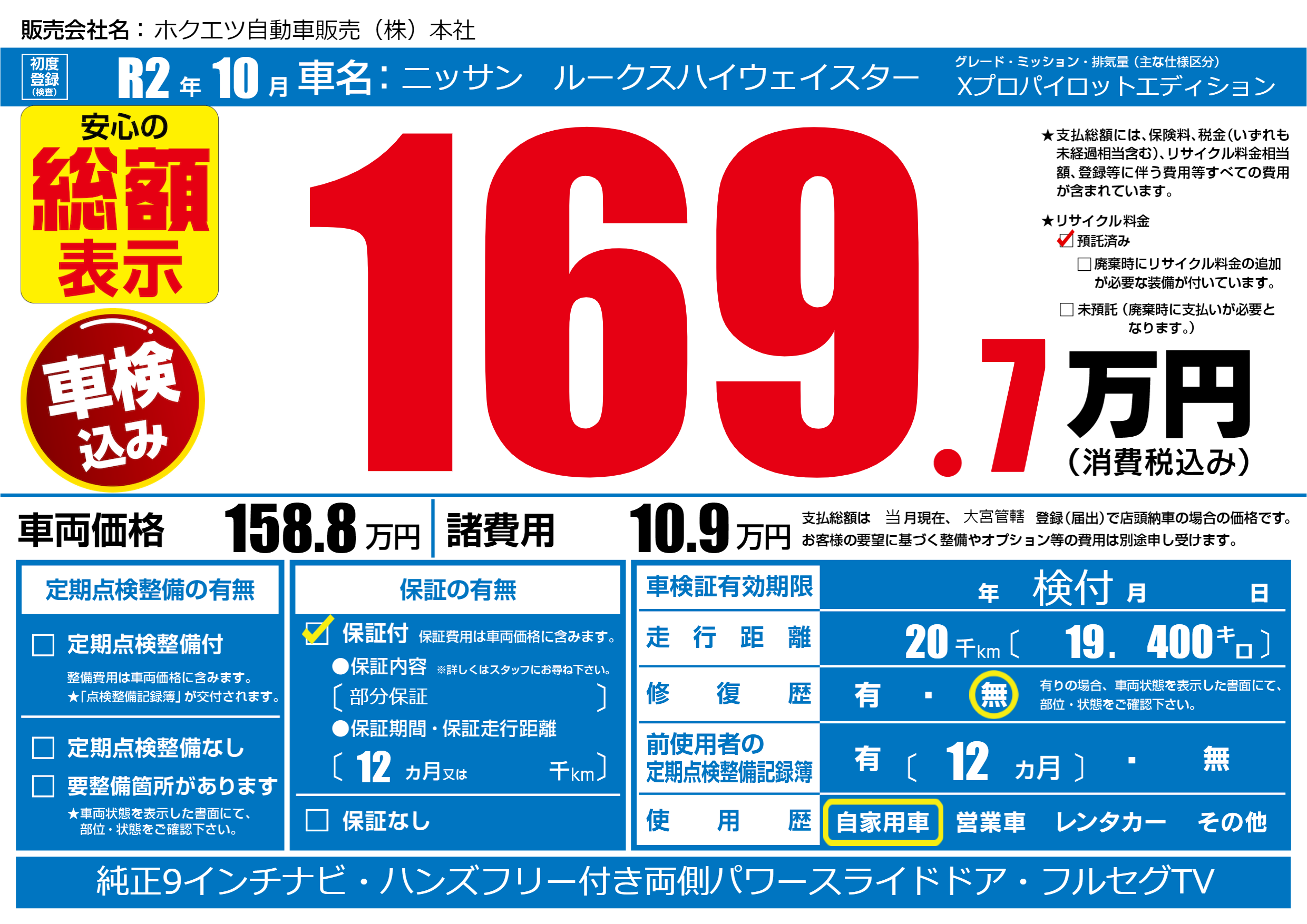 | 車名 | ニッサン ルークスハイウェイスター | グレード ミッション 排気量 |