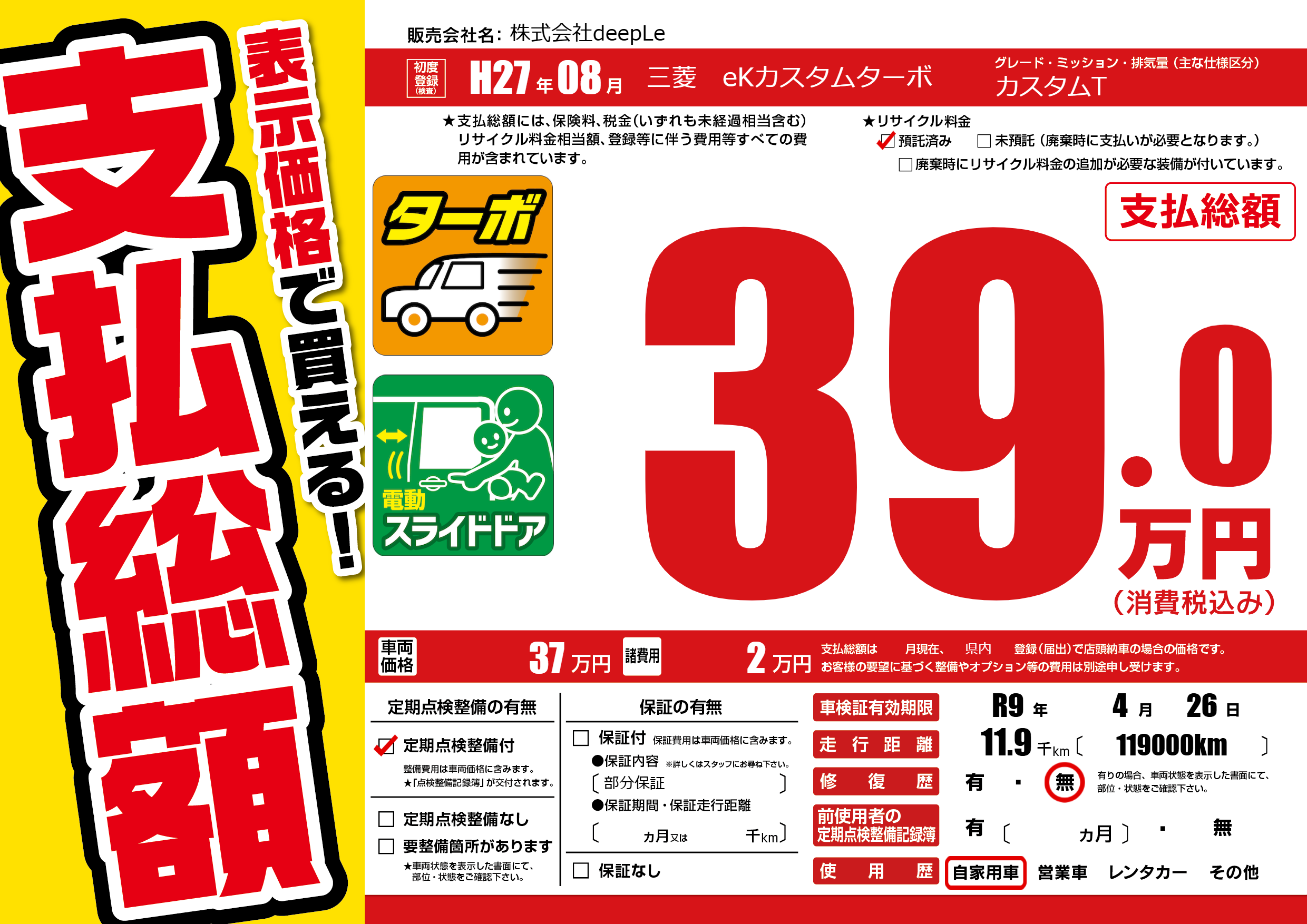 | 車名 | 三菱 eKカスタムターボ | グレード ミッション 排気量 |