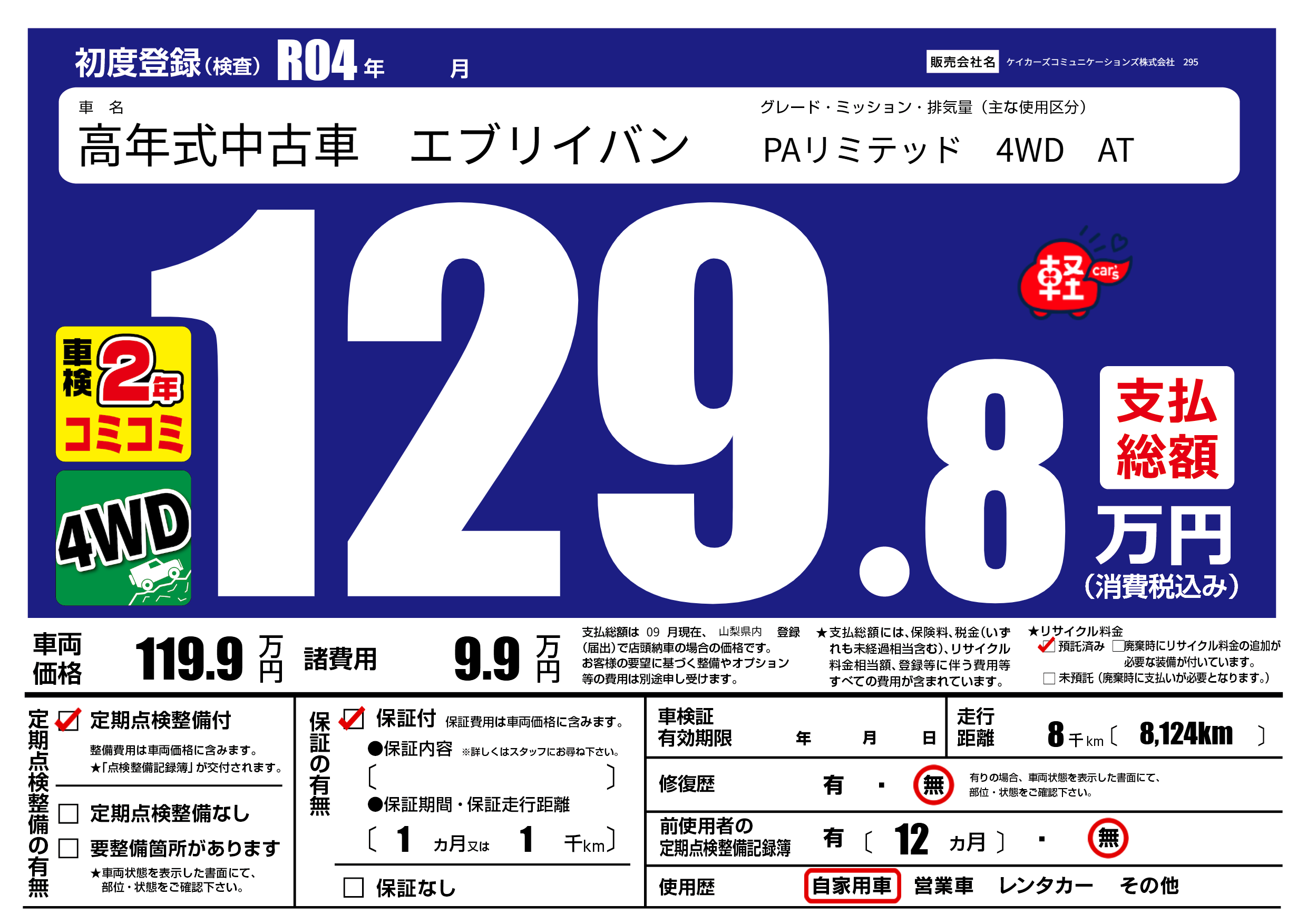 | 車名 | 高年式中古車 エブリイバン | グレード ミッション 排気量 |