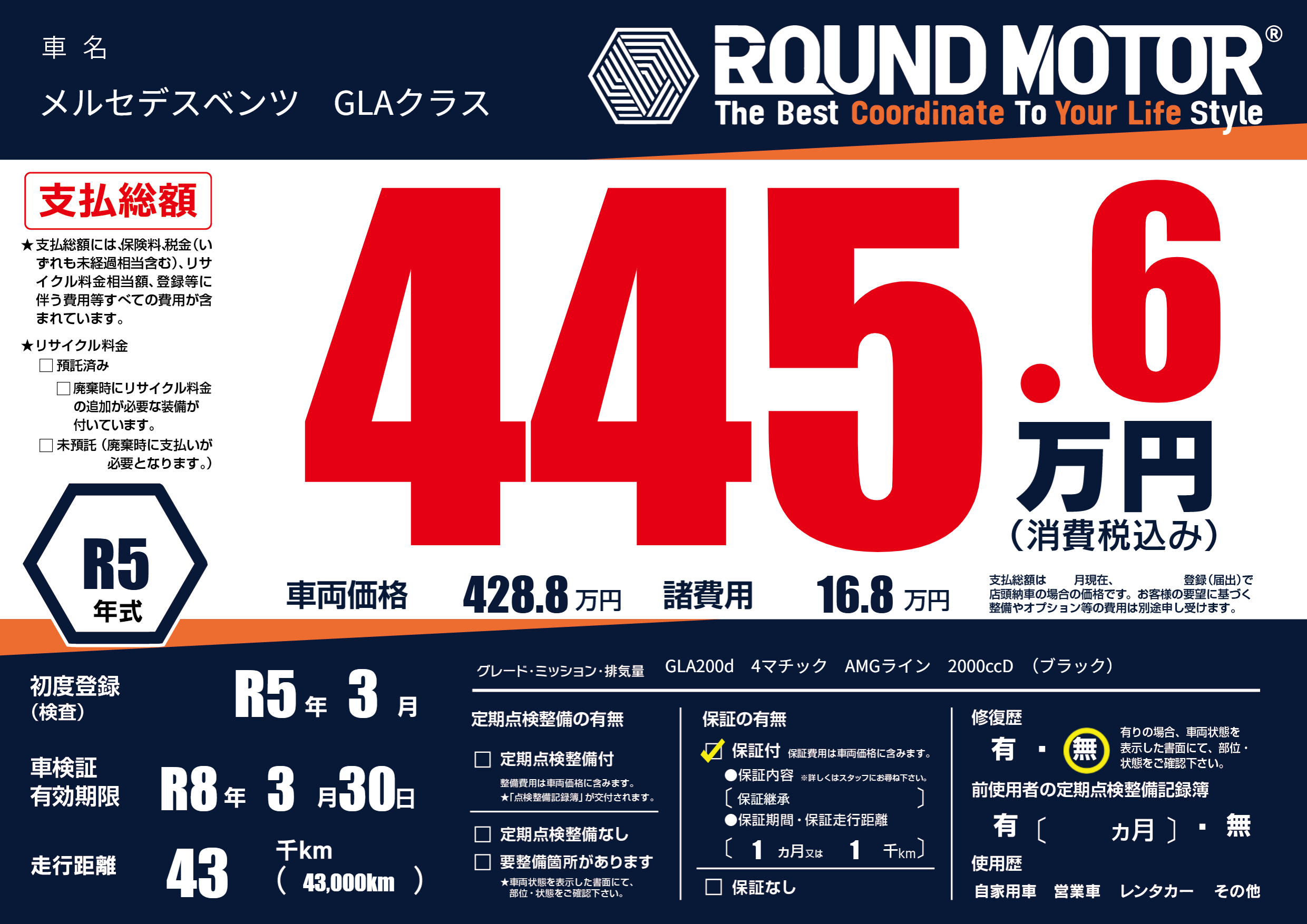 | 走行キロ | 4.3万km | 初年度登録 | R5年3月 |