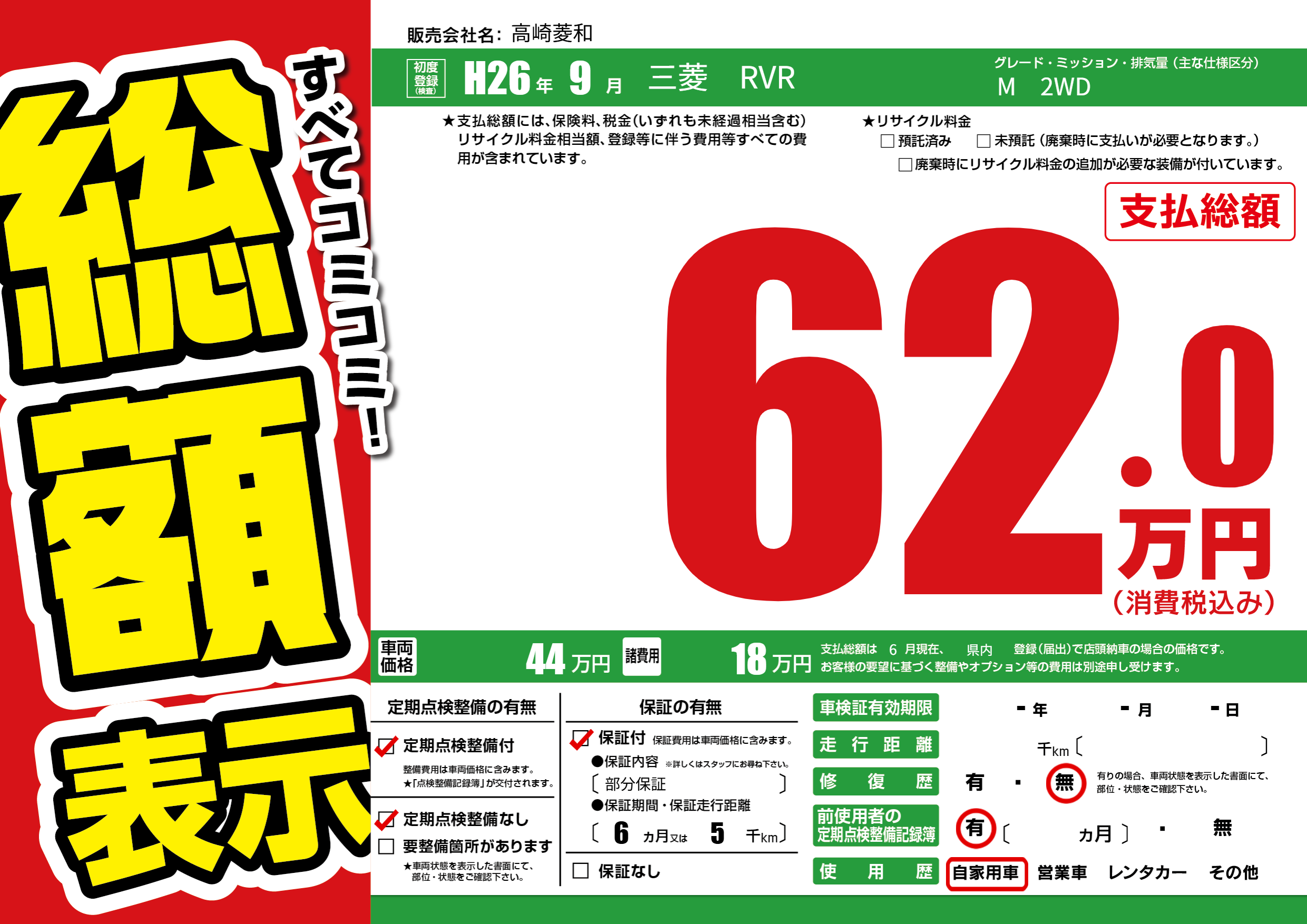 | 車名 | 三菱 RVR | グレード ミッション 排気量 |