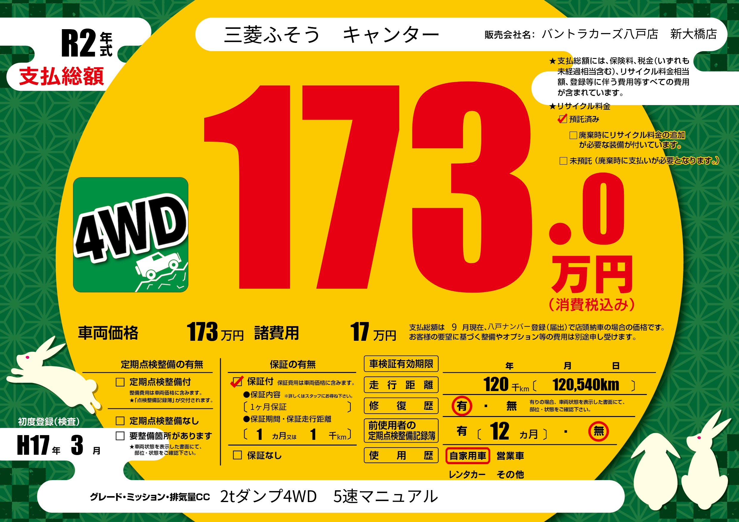 | 車名 | 三菱ふそう キャンター | グレード ミッション 排気量 |