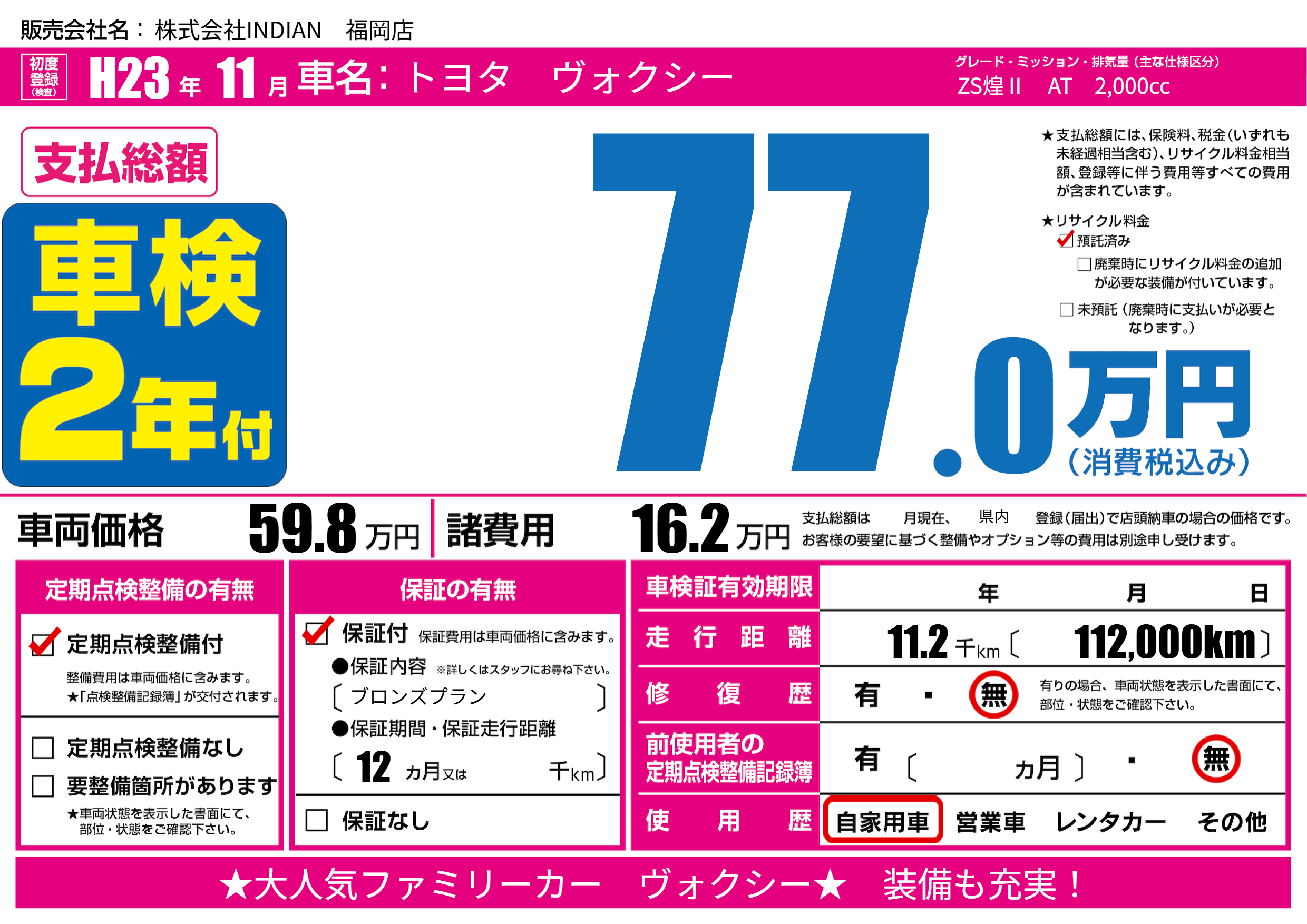 | 車名 | トヨタ ヴォクシー | グレード ミッション 排気量 |