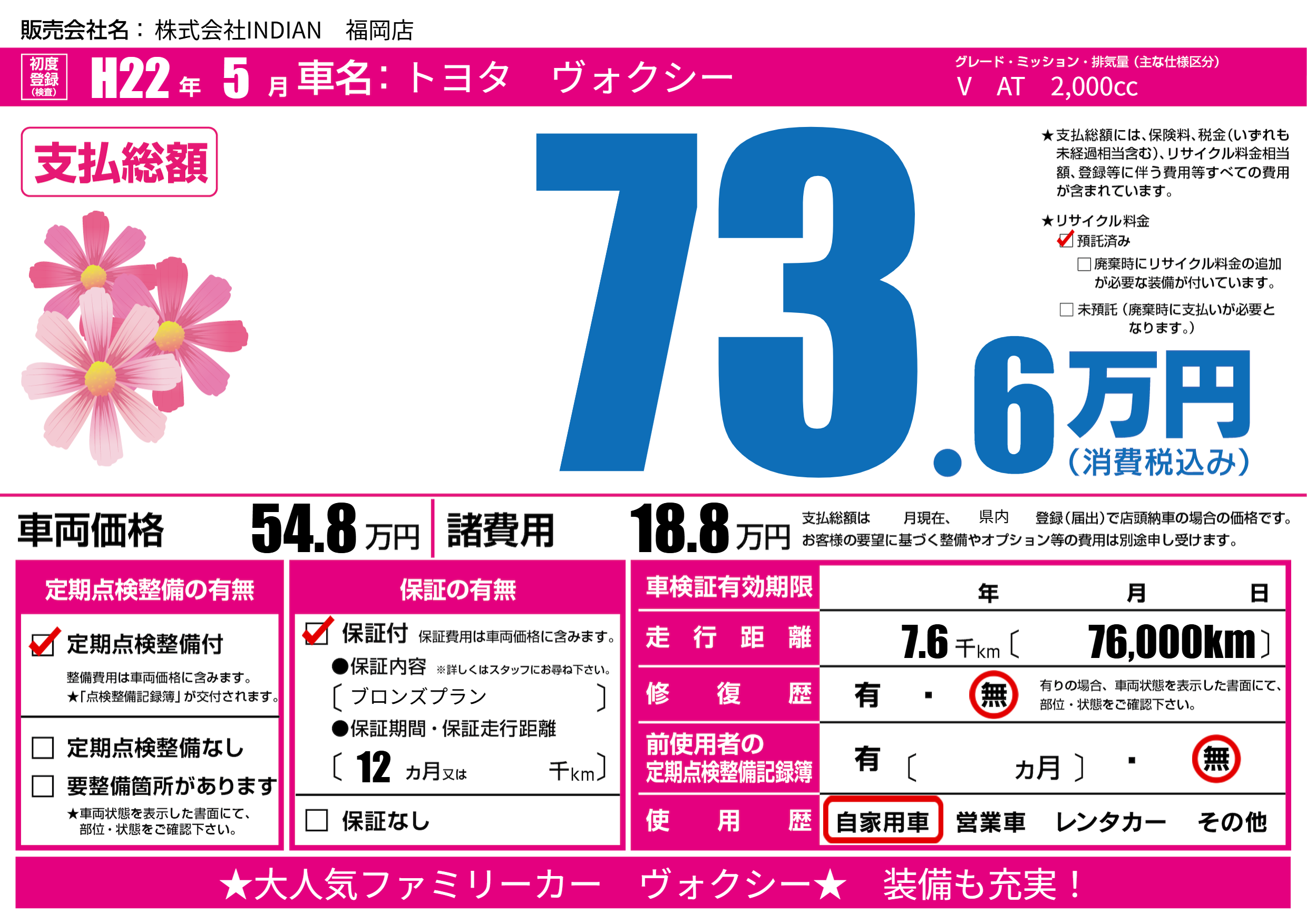 | 車名 | トヨタ ヴォクシー | グレード ミッション 排気量 |