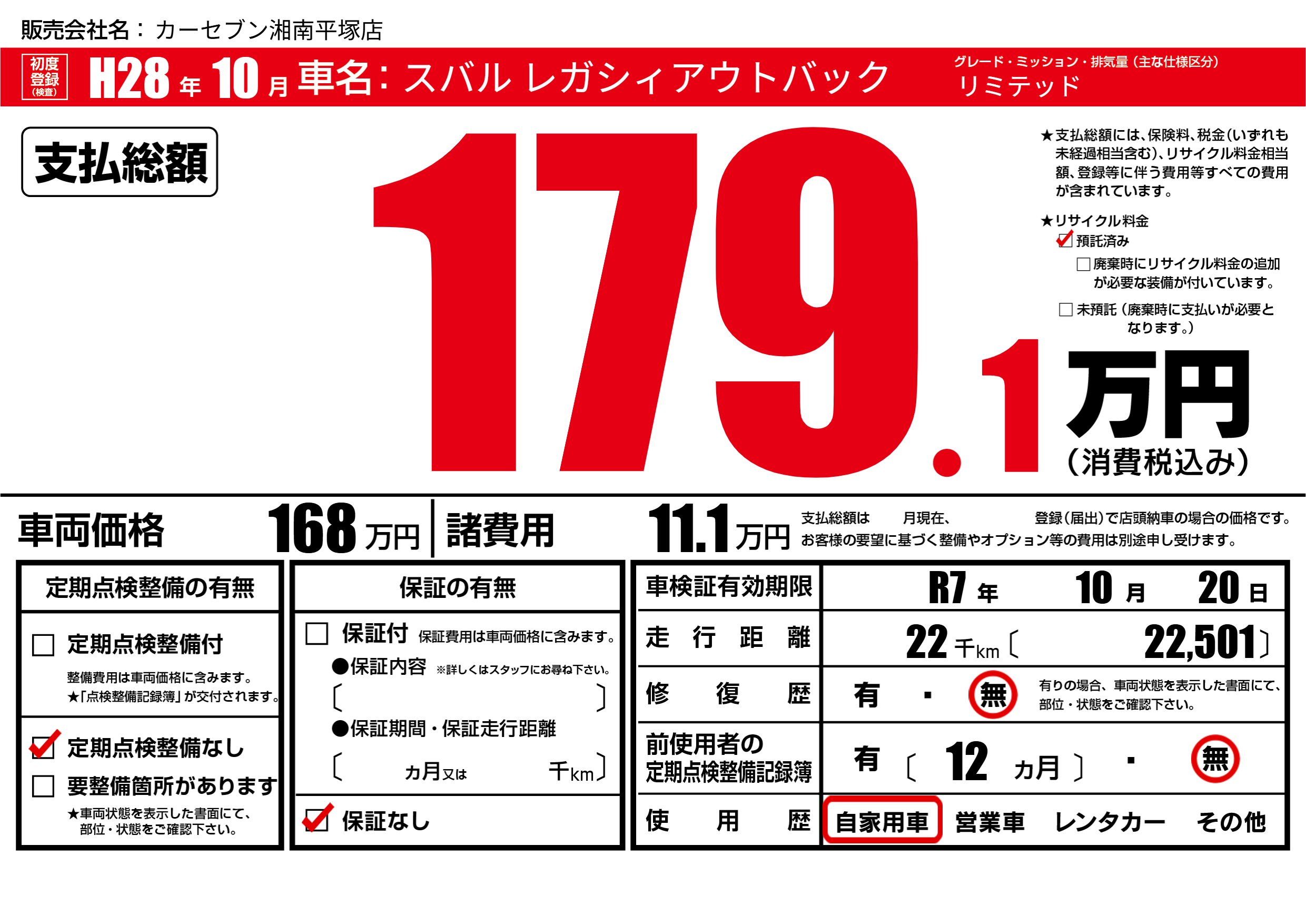 | 車名 | スバル レガシィアウトバック | グレード ミッション 排気量 |