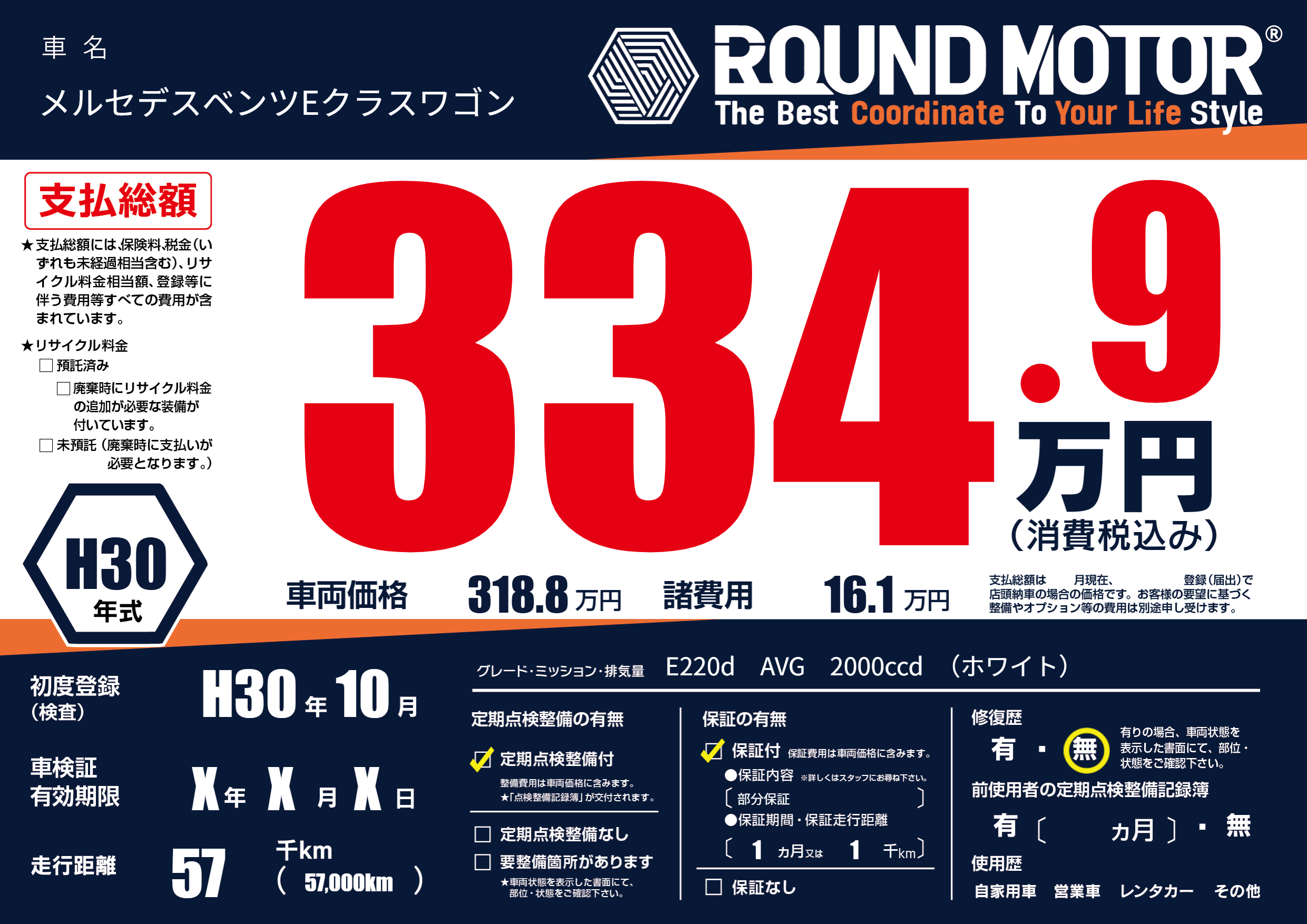 | 車名 | メルセデスベンツEクラスワゴン | グレード ミッション 排気量 |