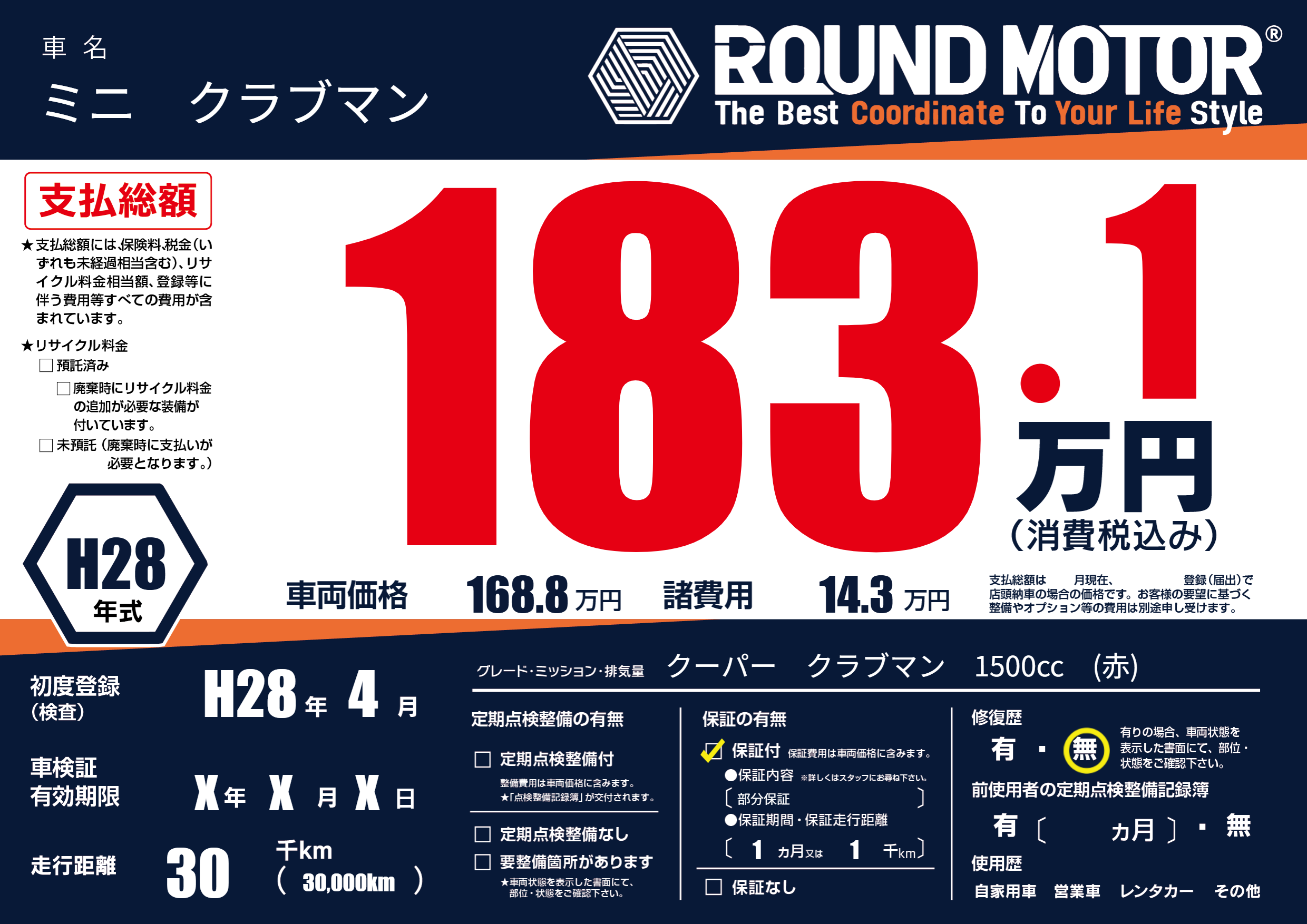 | 車名 | ミニ クラブマン | グレード ミッション 排気量 |