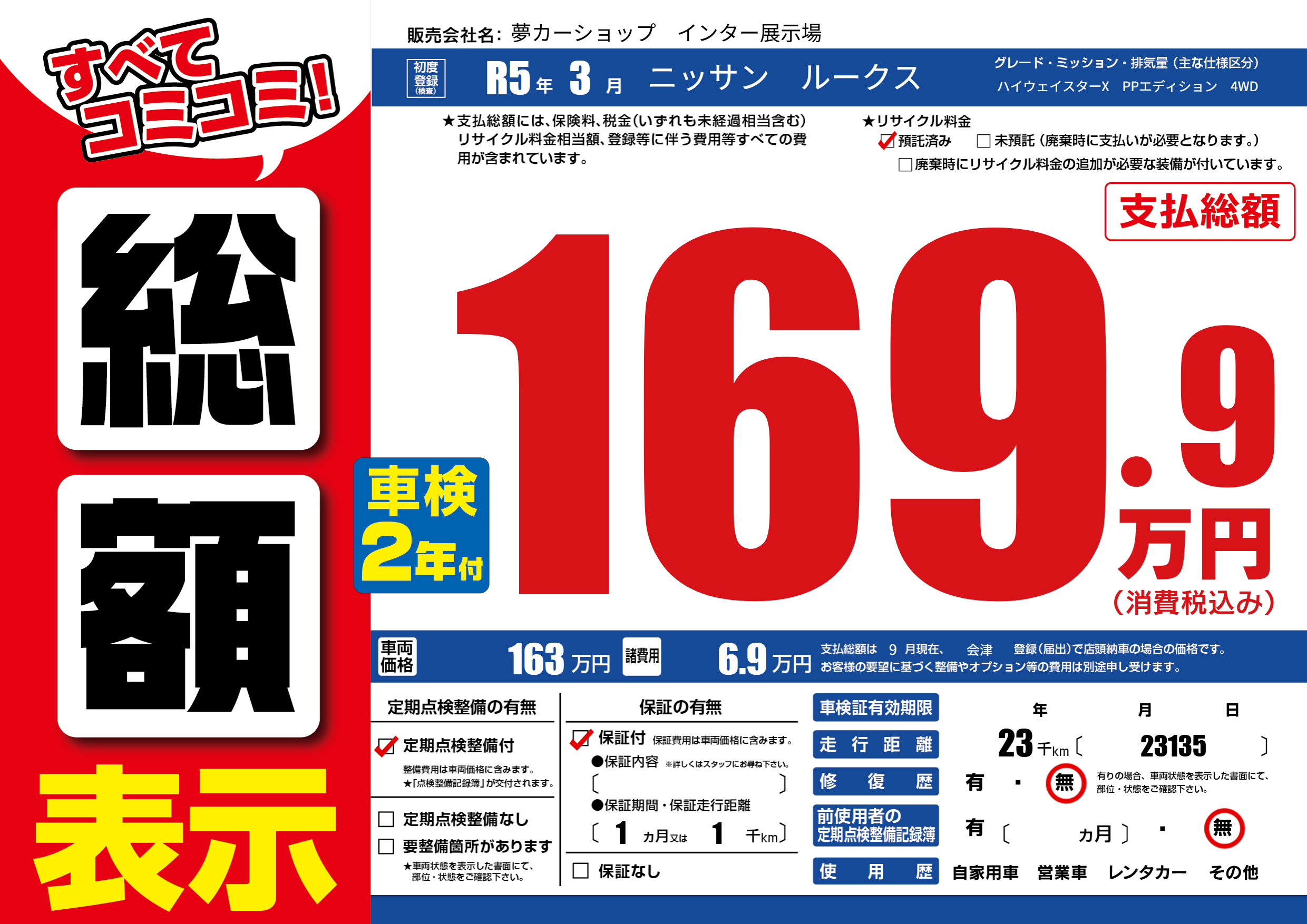 | 走行キロ | 2.3万km | 初年度登録 | R5年3月 |
