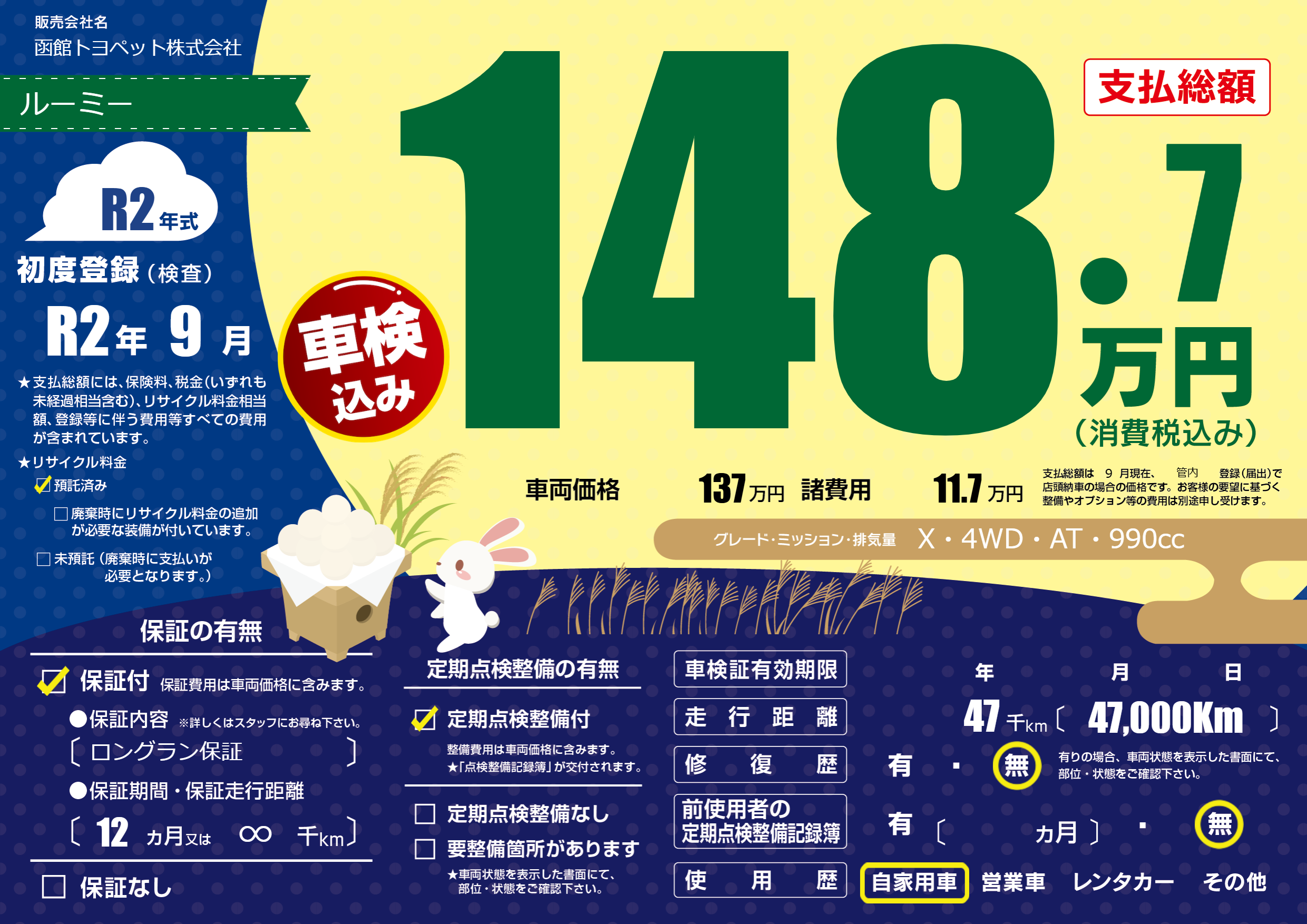 | 車名 | ルーミー | グレード ミッション 排気量 |