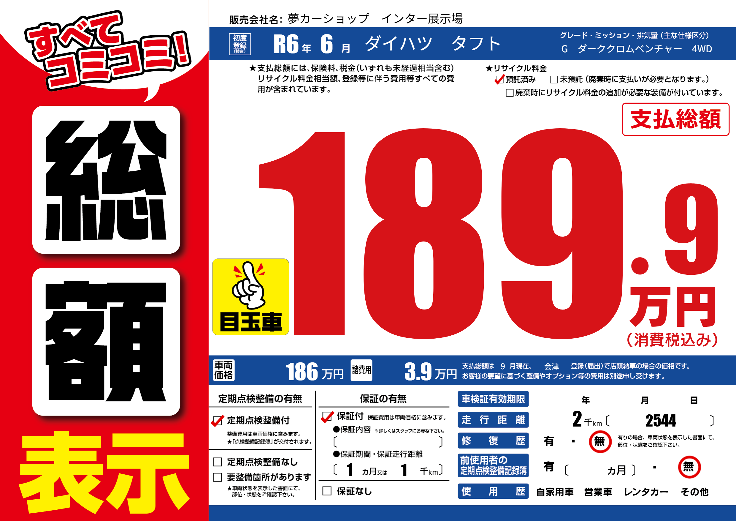 | 走行キロ | 0.2万km | 初年度登録 | R6年6月 |