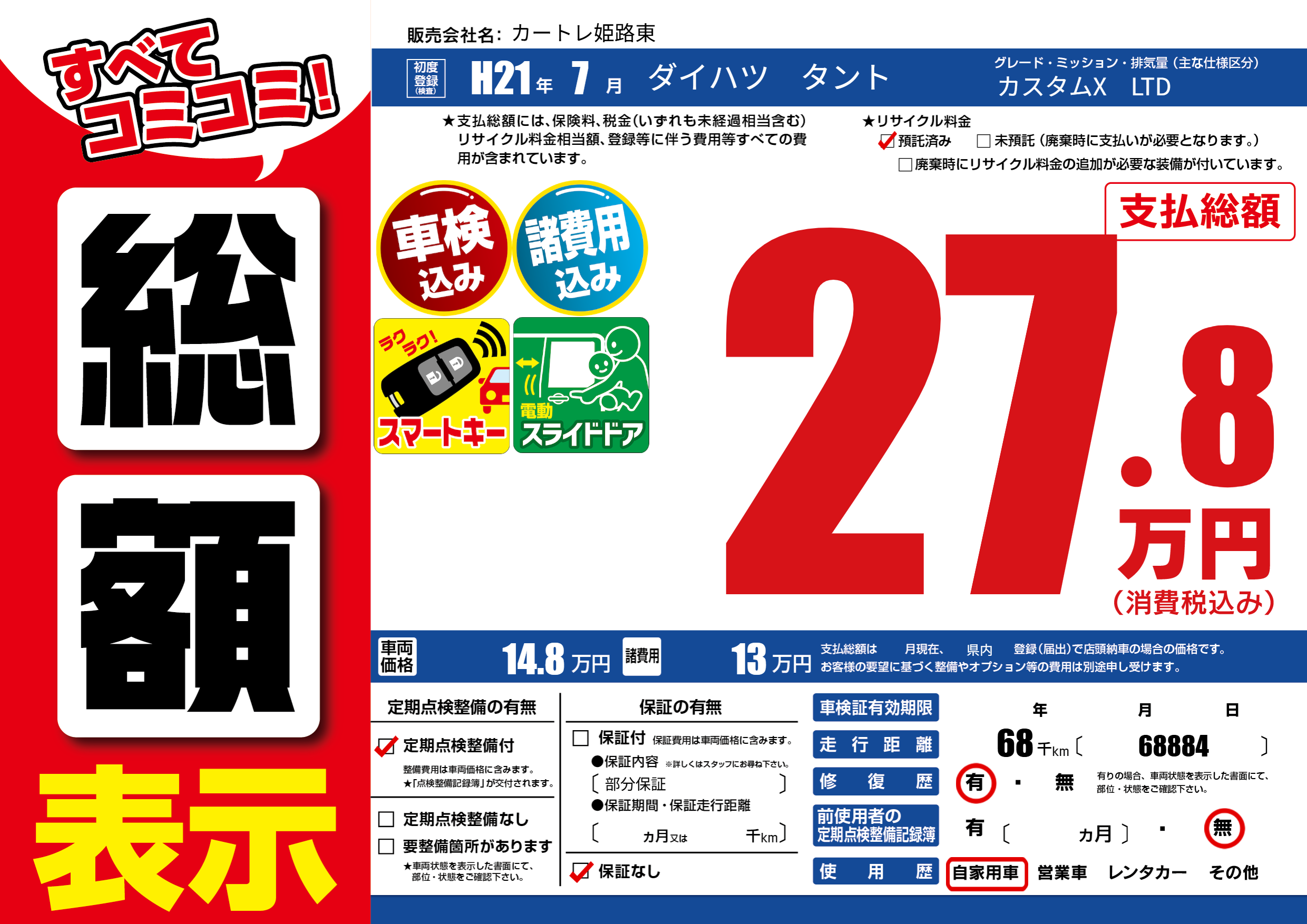 | 車名 | ダイハツ タント | グレード ミッション 排気量 |