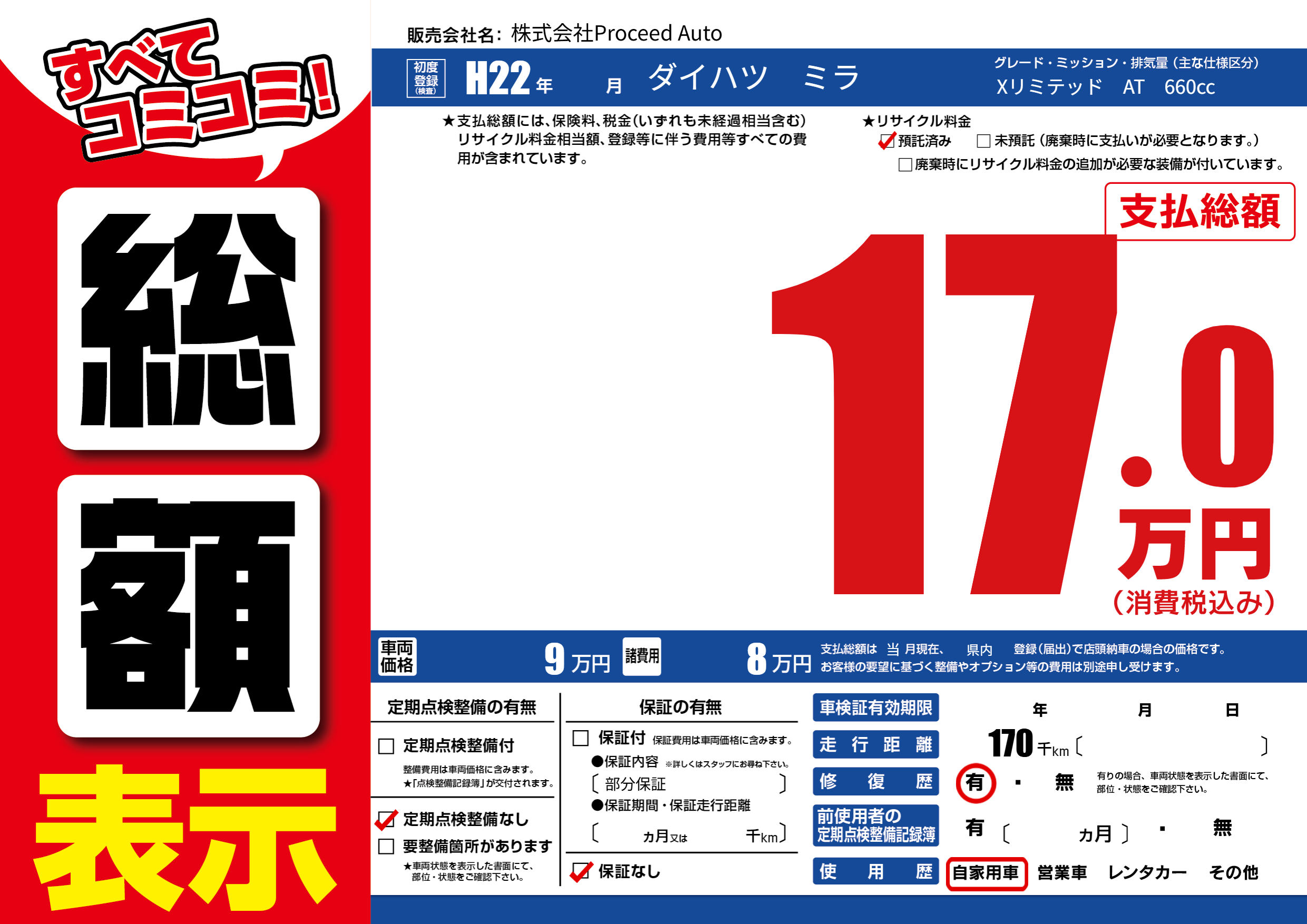 | 走行キロ | 17万km | 初年度登録 | H22年---月 |