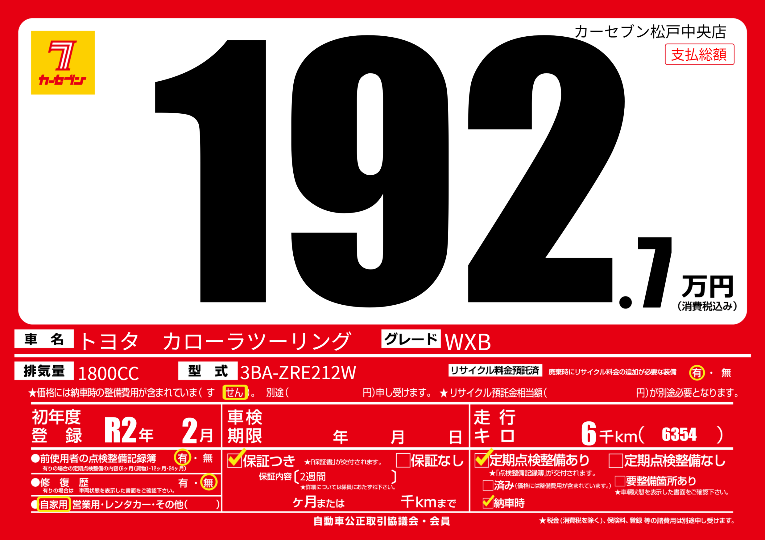 | 車名 | トヨタ カローラツーリング | グレード ミッション 排気量 |