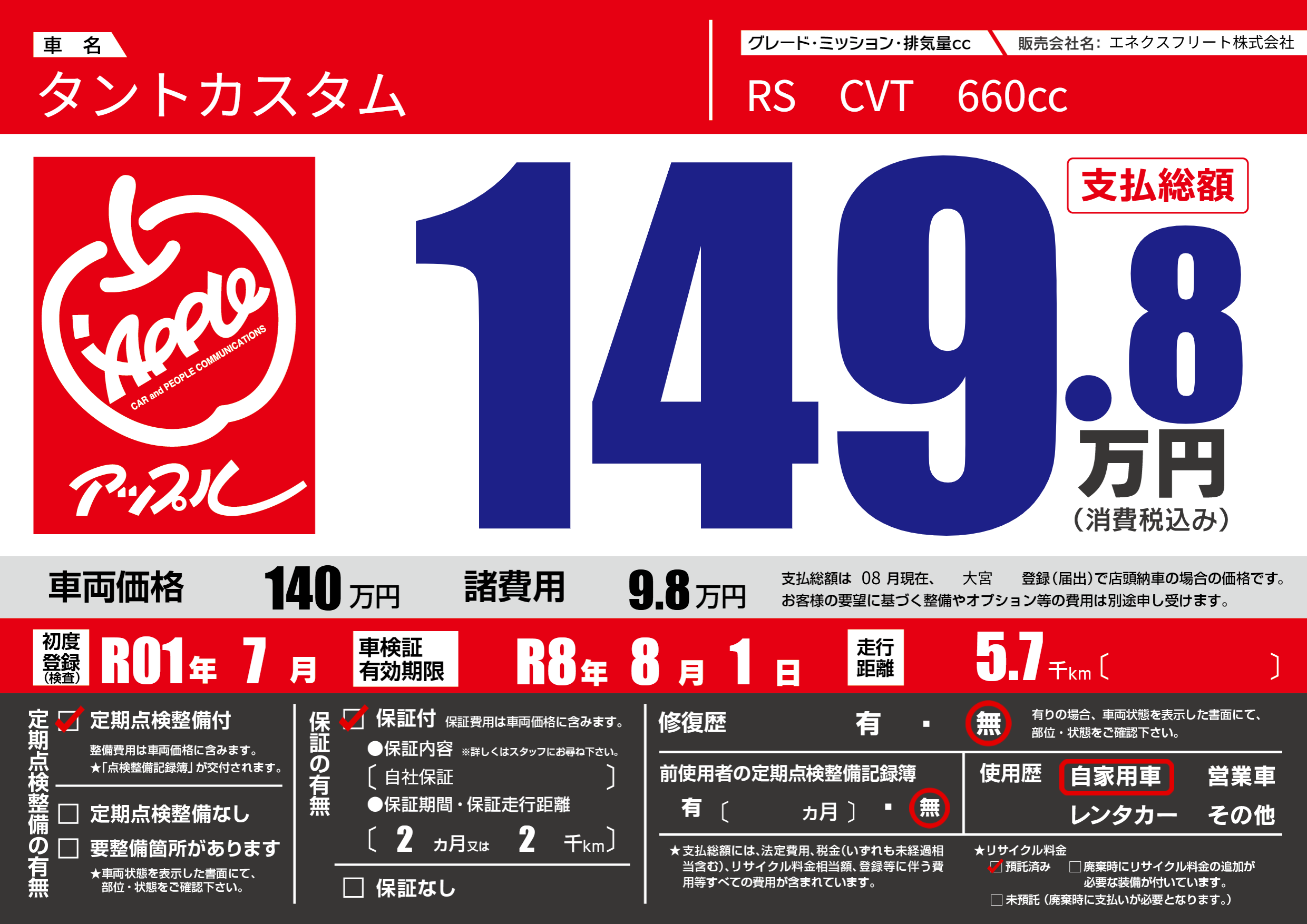 | 車検制限 | R8年 8月 1日 | ||