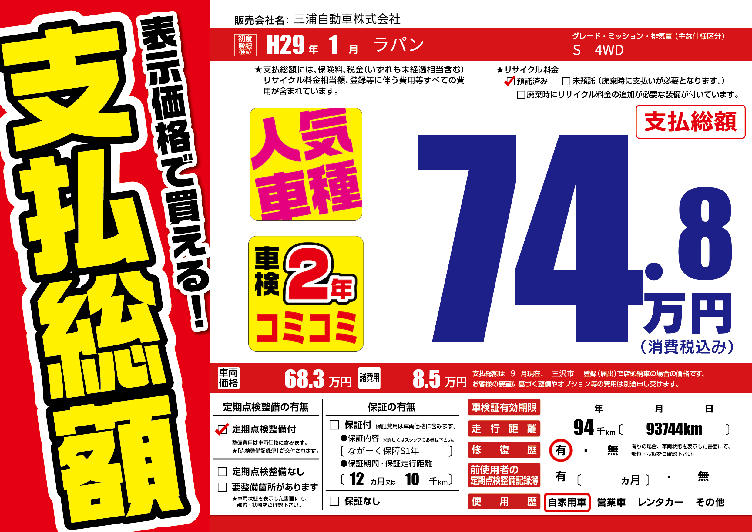| 走行キロ | 9.4万km | 初年度登録 | H29年1月 |