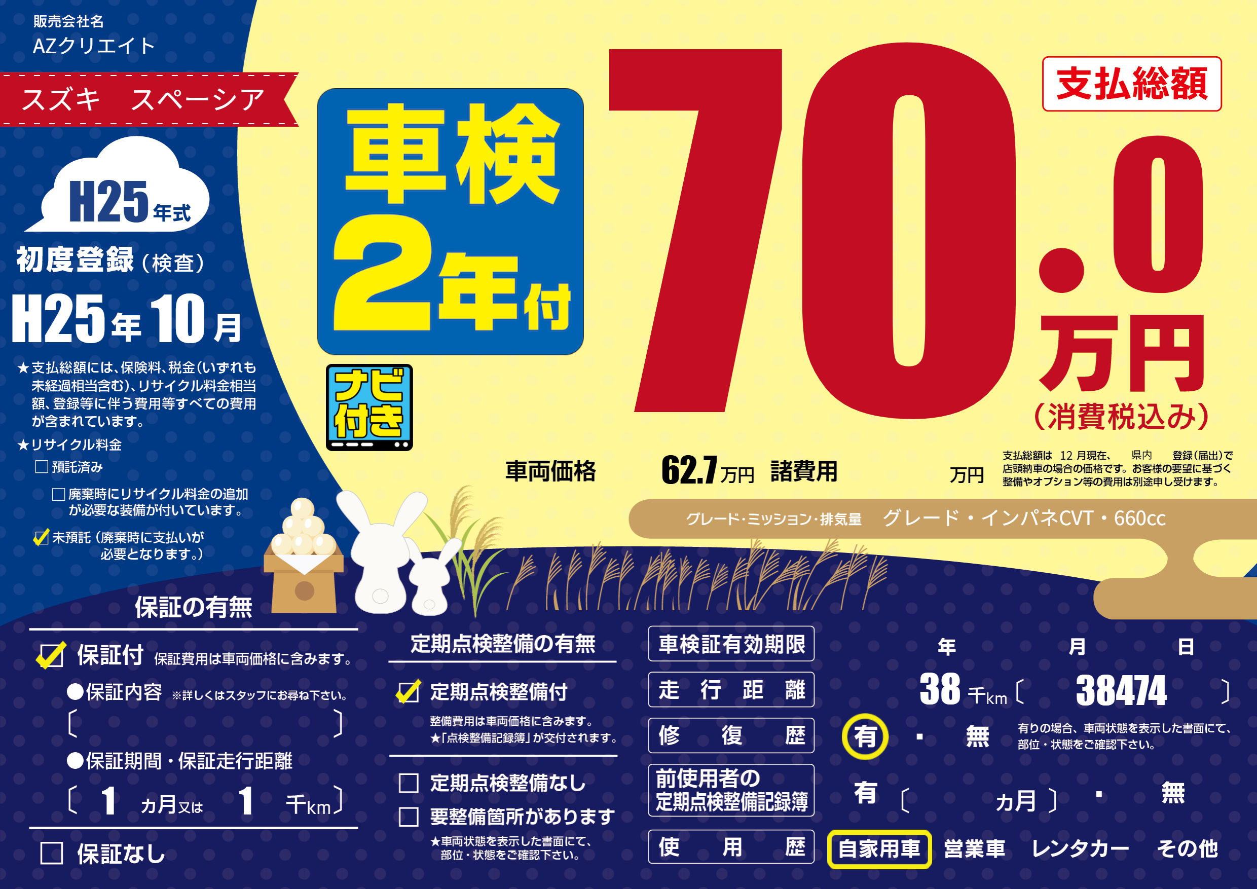 | 走行キロ | 3.8万km | 初年度登録 | H25年10月 |