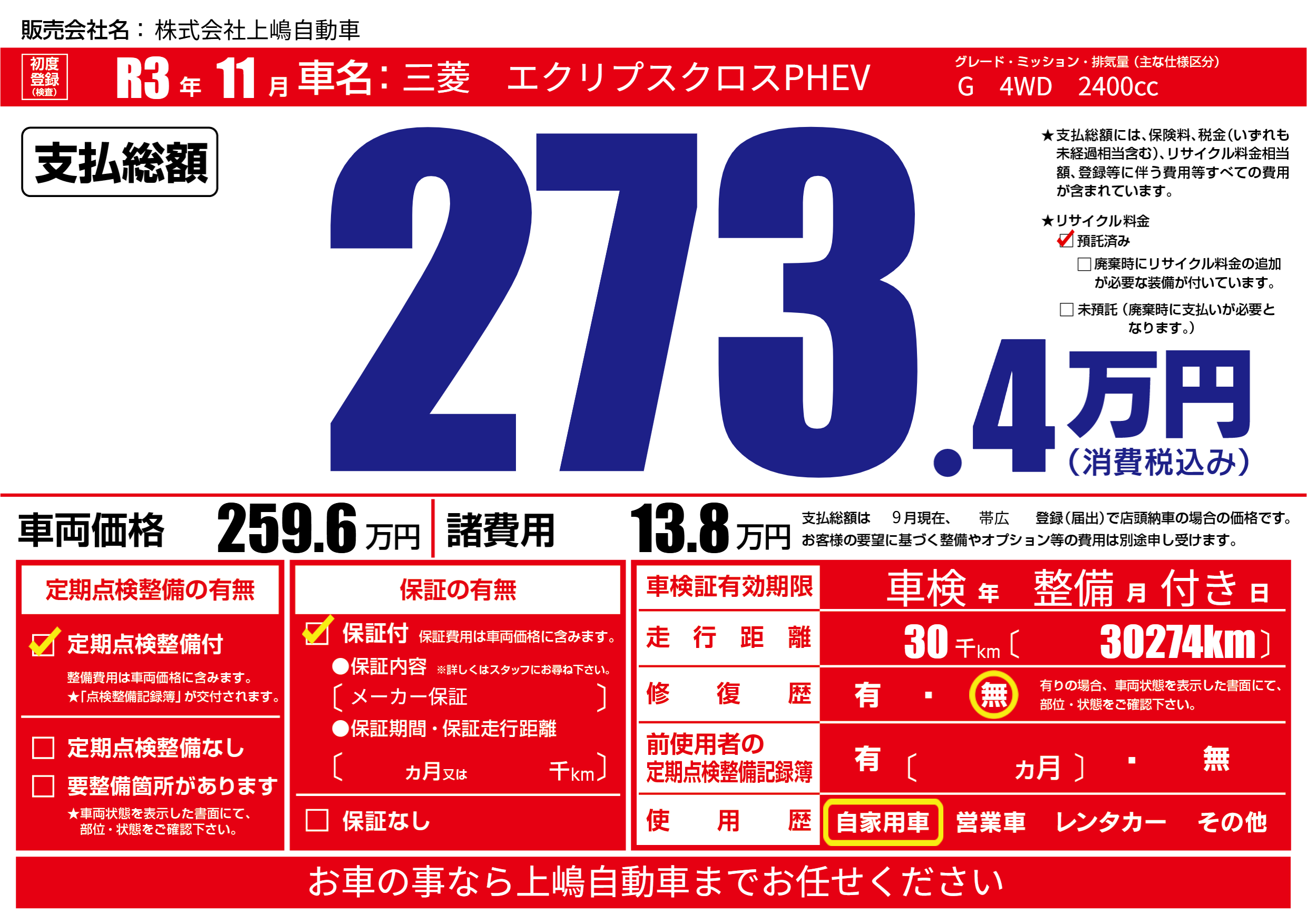| 車名 | 三菱 エクリプスクロスPHEV | グレード ミッション 排気量 |