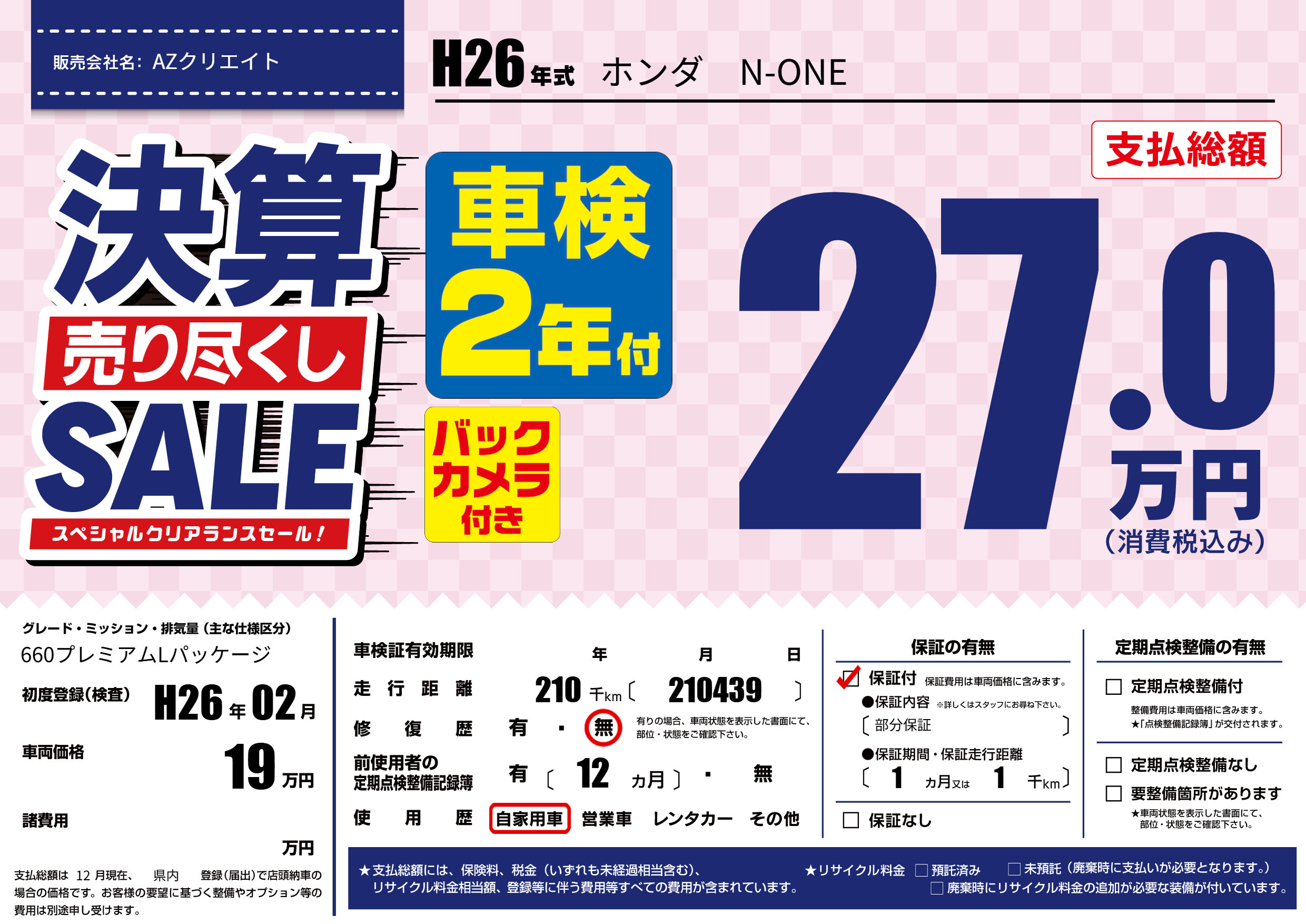 | 車名 | ホンダ N-ONE | グレード ミッション 排気量 |