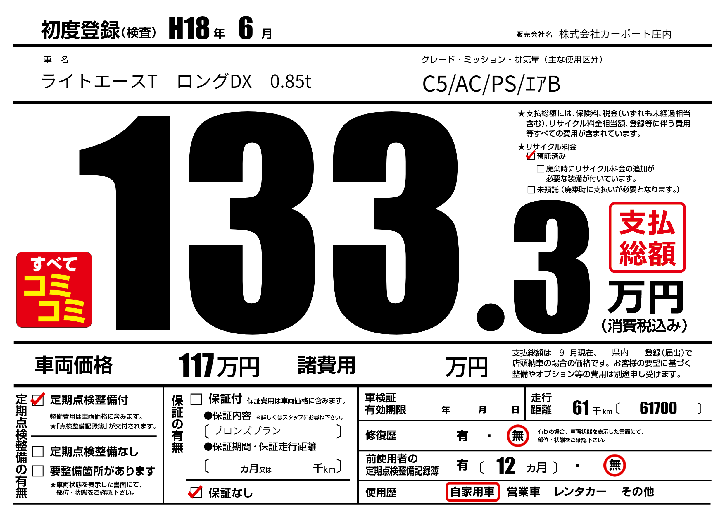 | 車名 | ライトエースT ロングDX 0.85t | グレード ミッション 排気量 |