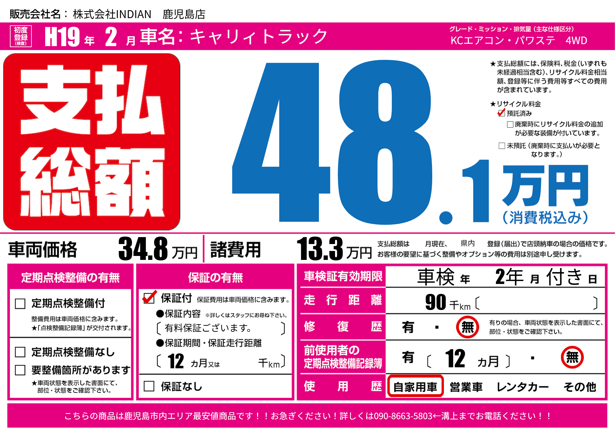 | 走行キロ | 9万km | 初年度登録 | H19年2月 |