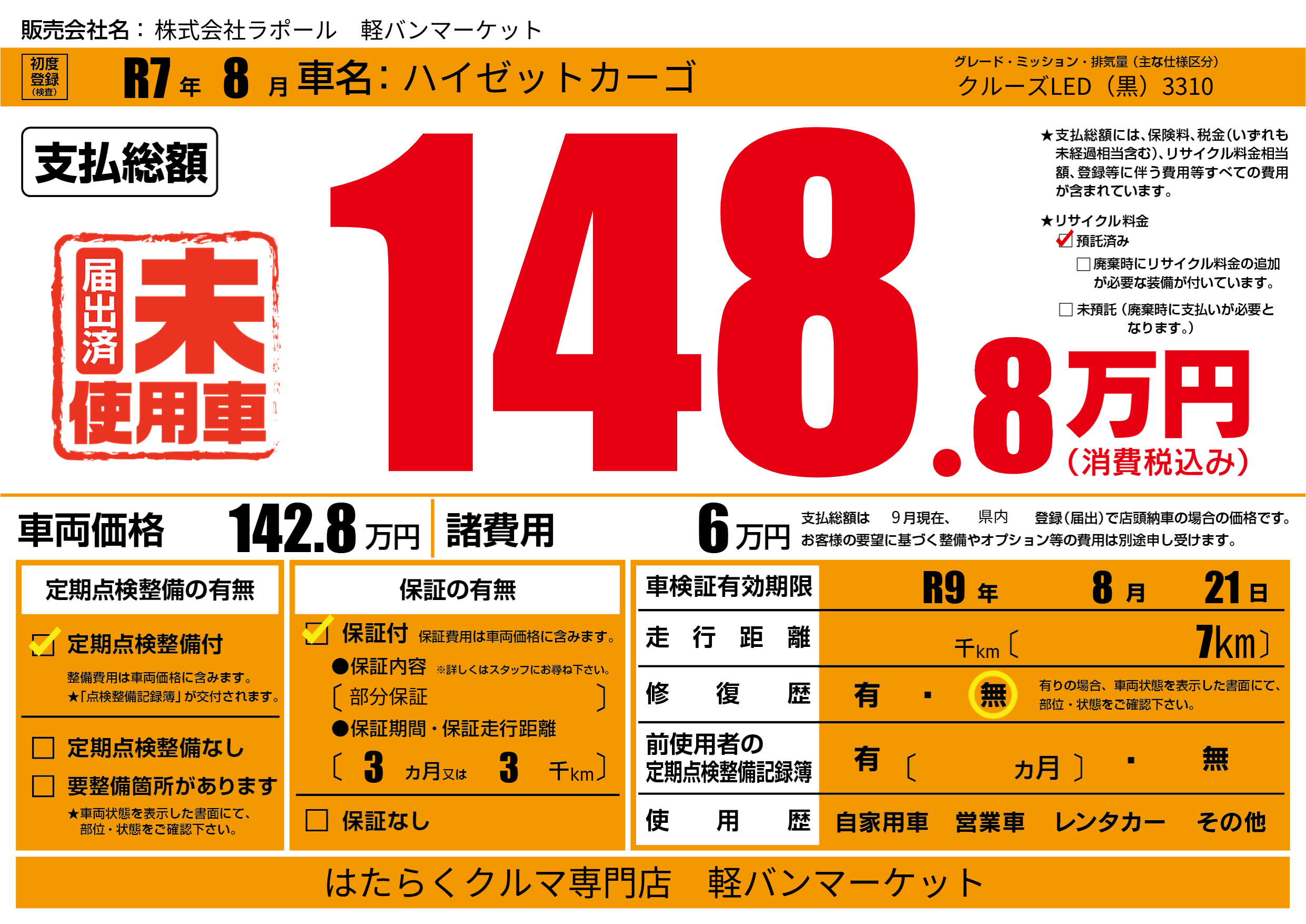 | 走行キロ | - | 初年度登録 | R7年8月 |