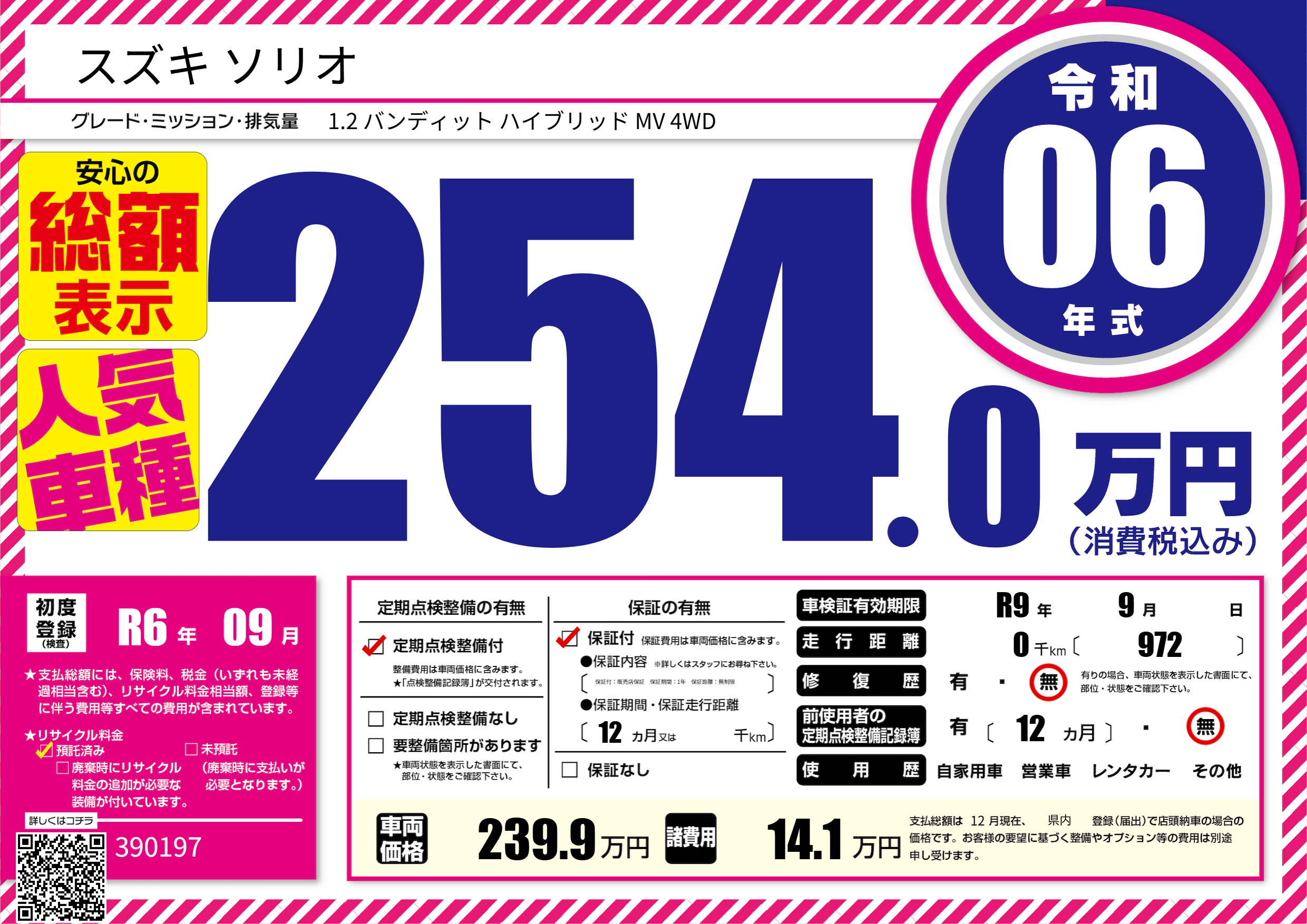 | 走行キロ | - | 初年度登録 | R6年09月 |