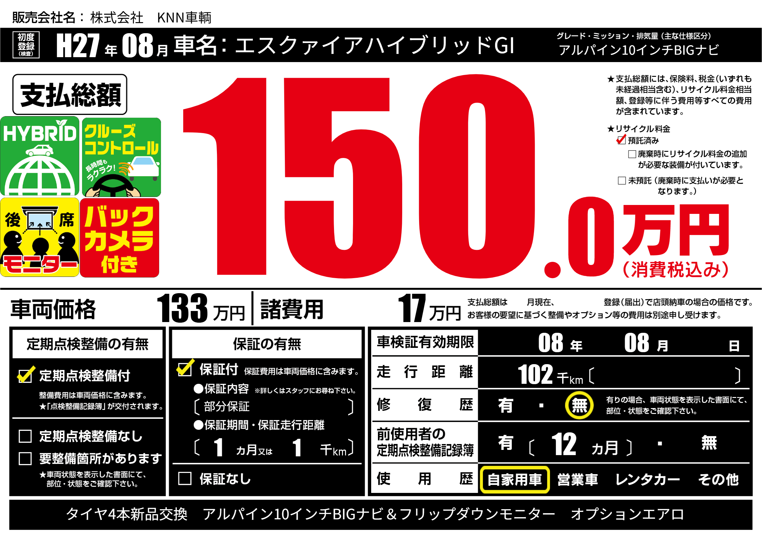 | 走行キロ | 10.2万km | 初年度登録 | H27年08月 |