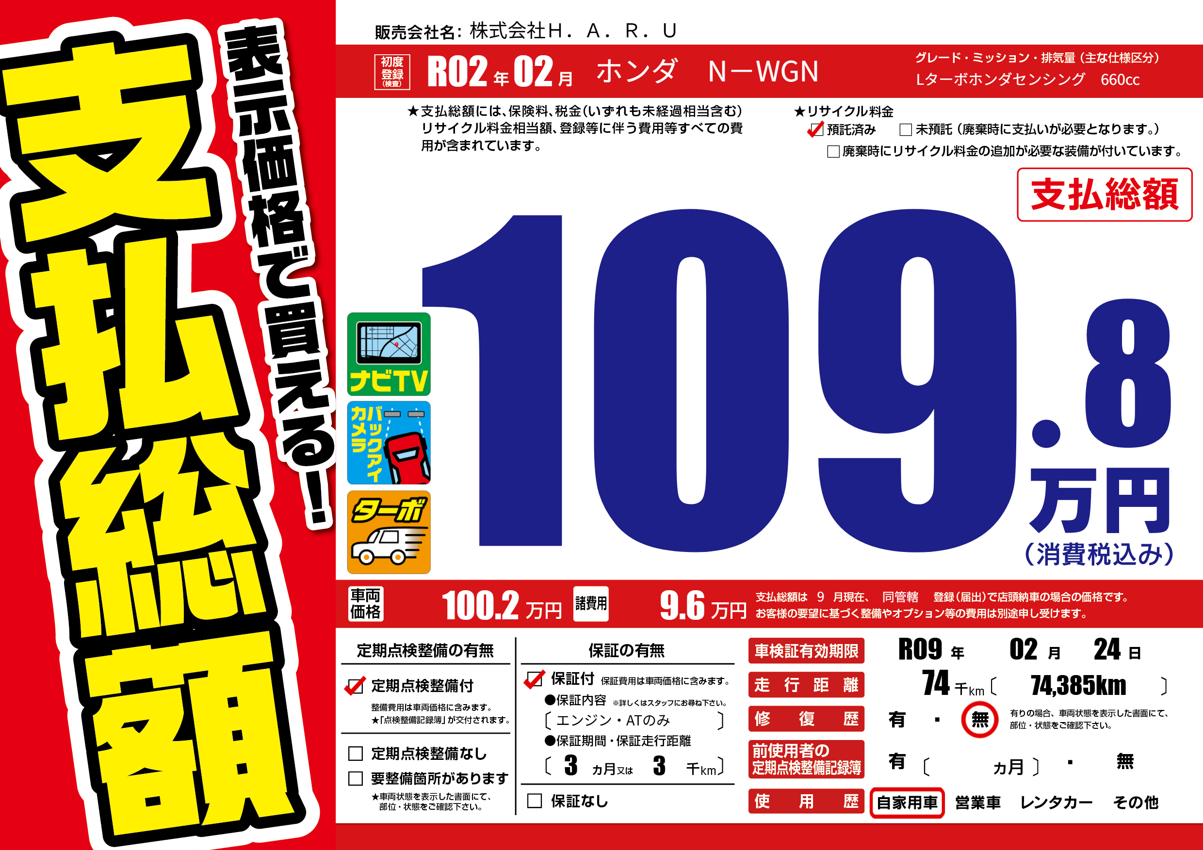 | 車名 | ホンダ N-WGN | グレード ミッション 排気量 |