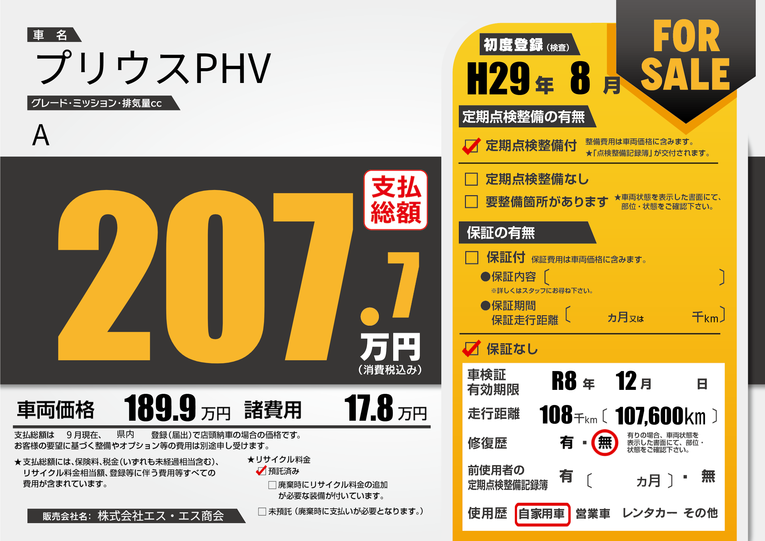 | 車名 | プリウスPHV | グレード ミッション 排気量 |