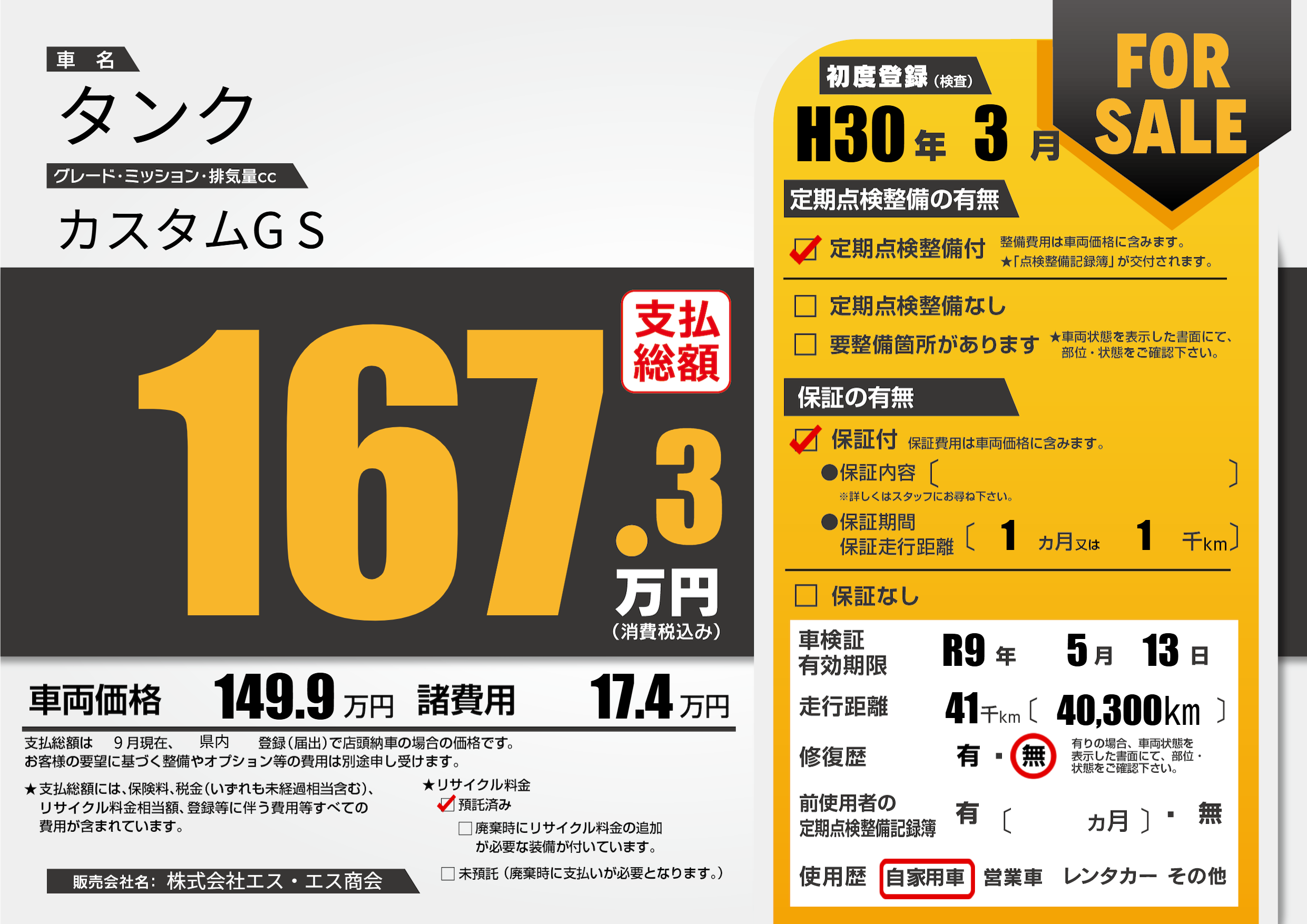 | 走行キロ | 4.1万km | 初年度登録 | H30年3月 |
