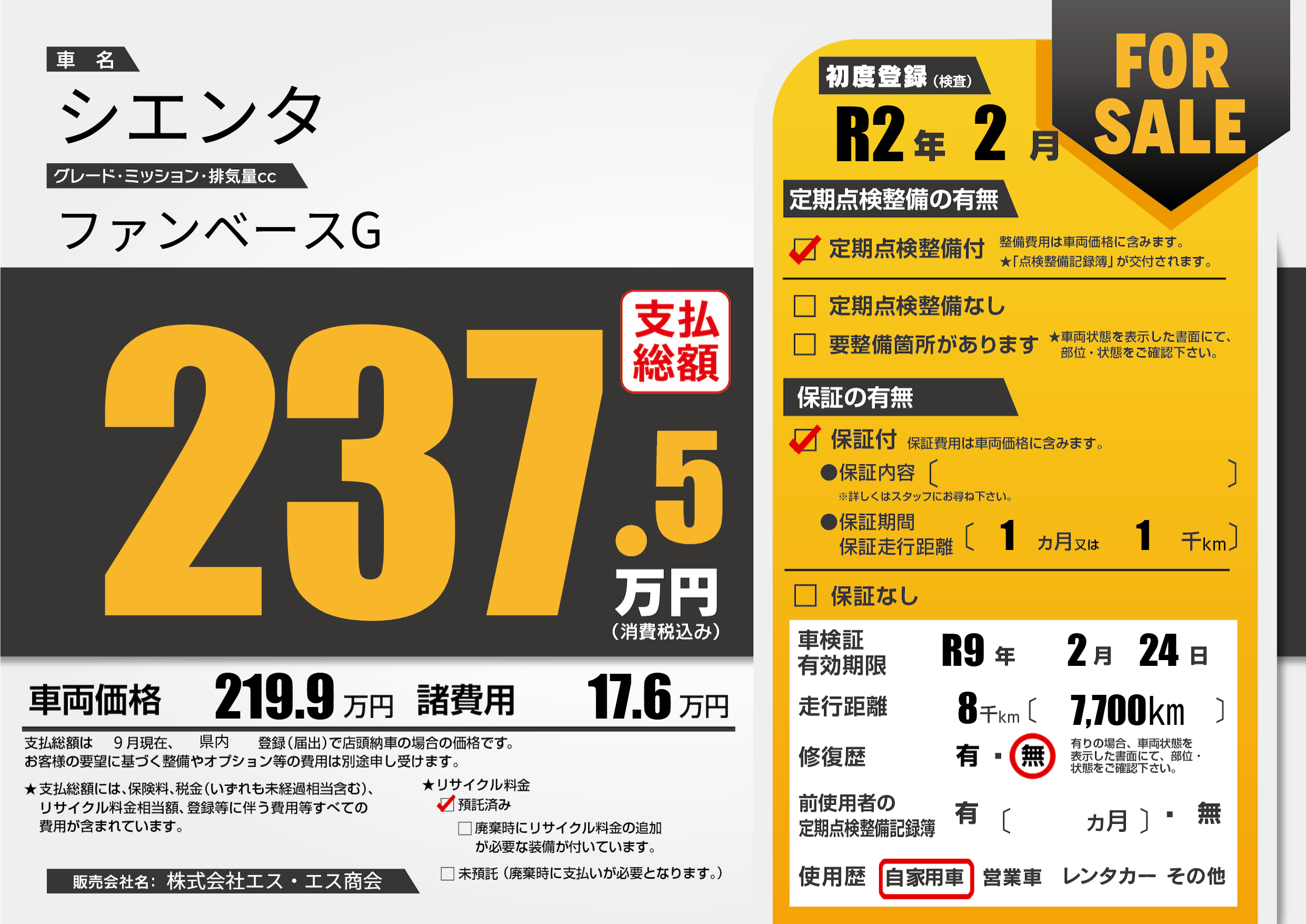 | 車名 | シエンタ | グレード ミッション 排気量 |
