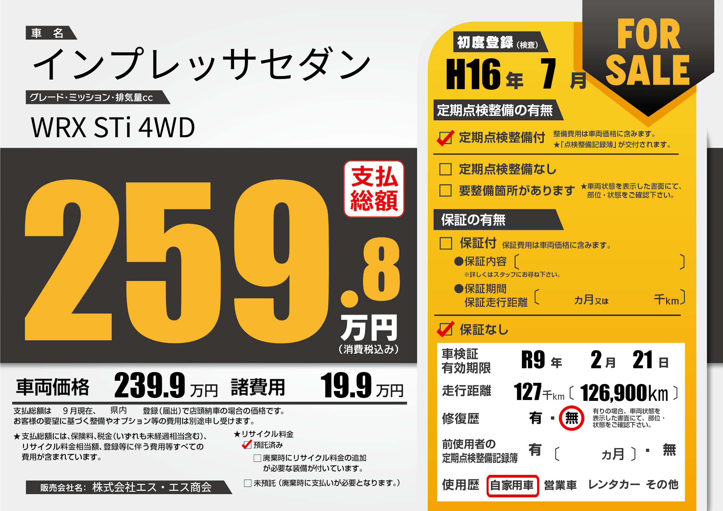 | 車名 | インプレッサセダン | グレード ミッション 排気量 |