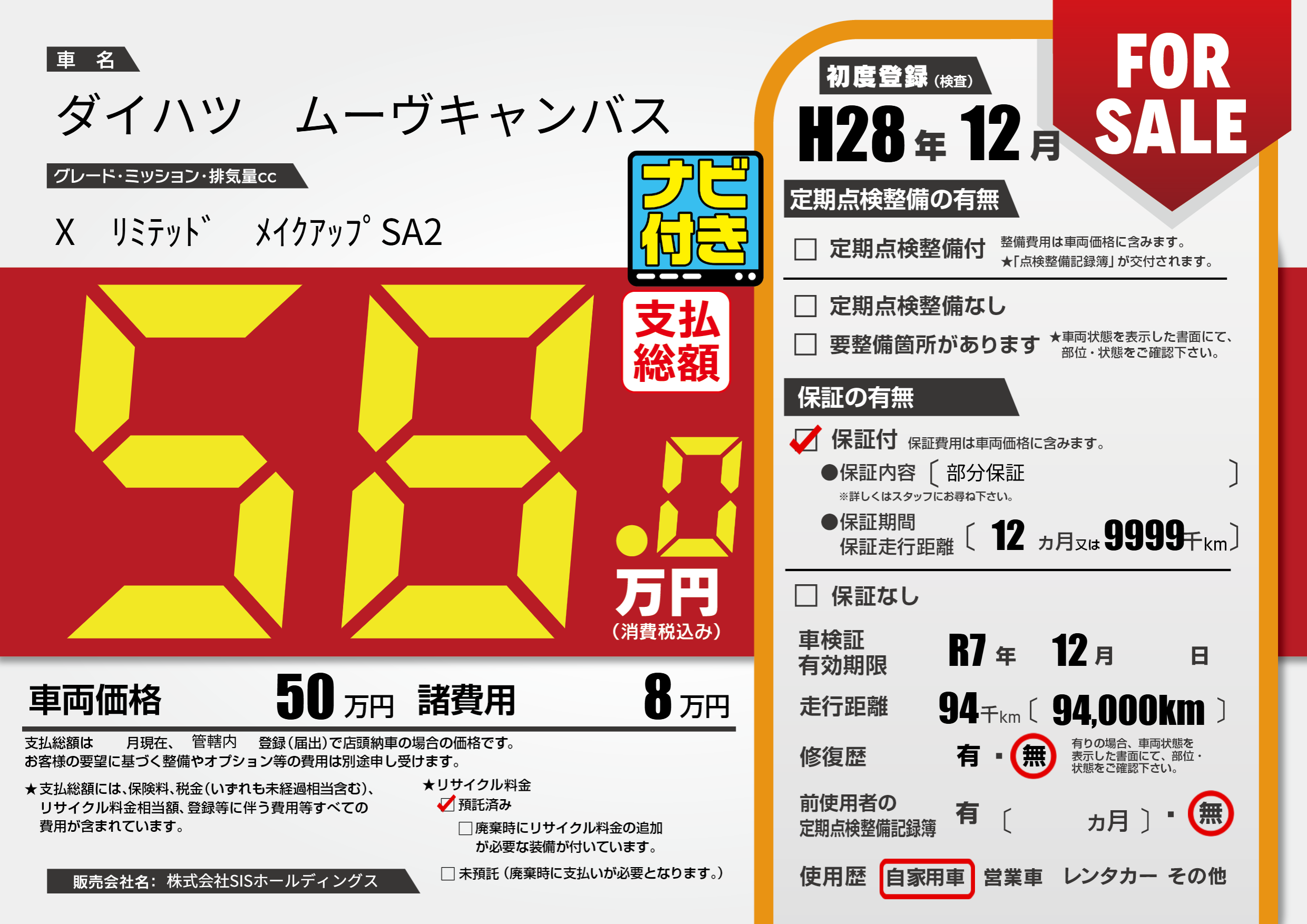 | 走行キロ | 9.4万km | 初年度登録 | H28年12月 |